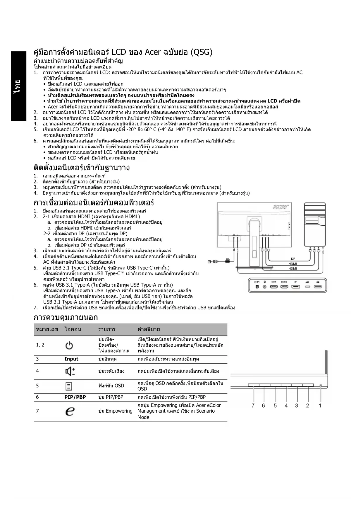 การเปลี่ยนแปลงหรือแกไขที่ไมไดรับการอนุมัติโดยชัดแจงจากผูผลิตอาจทําใหสิทธิ์ของผูใชซึ่งไดรับจาก Federal Communications Commission ในการใชงานผลิตภัณฑนี้เปนโมฆะได เงื่อนไขการใชงาน อุปกรณนี้เปนไปตาม Part 15 ของกฎ FCC การใชงานตองอยูภายใตเงื่อนไขสองขอตอไปนี้: (1) อุปกรณนี้อาจไมกอใหเกิดสัญญาณรบกวนที่เปน อันตรายและ (2) อุปกรณนี้ตองยอมรับสัญญาณรบกวนทั้งหมดที่ไดรับ รวมถึงสัญญาณรบกวนที่อาจกอใหเกิดการทํางานที่ไมพึงประสงค ขอสังเกต: ผูใชของประเทศแคนาดา อุปกรณดิจิตอล Class B นี้เปนไปตาม Canadian ICES-003 Remarque à l'intention des utilisateurs canadiens Cet appareil numérique de la classe B est conforme à la norme NMB-003 du Canada. การกําจัดขยะจากอุปกรณโดยผูใชในแบบสวนตัวในครัวเรือนภายในสหภาพยุโรป สัญลักษณนี้ที่อยูบนผลิตภัณฑนี้หรือบนบรรจ ุภัณฑเปนการระบุวาผลิตภัณฑนี้จะตองไมถูกกําจัดรวมกับขยะในครัวเรือนอื่นๆ ของคุณ โดยจะเปนความรับผิดชอบของคุณในการกําจัดขยะจากอุปกรณโดยทิ้งมอบใหจุดเก็บรวบรวมที่กําหนดไวสําหรับการรีไซเคิลขยะ จากอุปกรณอิเล็กทรอนิกสและเครื่องใชไฟฟาโดยเฉพาะ การเก็บแยกและรีไซเคิลขยะจากอุปกรณในเวลาที่จะกําจัดจะชวยอนุรักษ ทรัพยากรธรรมชาติและทําใหแนใจไดวาจะไดรับการรีไซเคิลดวยวิธีที่ชวยปกปองสุขภาพของมน ุษยและสิ่งแวดลอม สําหรับขอมูล เพิ่มเติมเกี่ยวกับสถานที่ที่คุณสามารถสงมอบขยะจากอุปกรณของคุณสําหรับการรีไซเคิล โปรดติดตอสํานักงานเขต (ที่วาการอําเภอ) ในทองถิ่นของคุณ เทศบาลกําจัดขยะในครัวเรือน หรือรานคาที่คุณซื้อผลิตภัณฑ ขอความคําเตือนสําหรับแมเหล็ก อุปกรณอิเล็กทรอนิกสบางประเภท เชนฮารดไดรฟ อุปกรณ USB คอมพิวเตอรแท็บเล็ต แล็ปท็อป โทรศัพทมือถือ นาฬิกา หูฟง ลําโพง บัตรเครดิต บ ัตรประจําตัวแบบแมเหล็ก ฯลฯ นั้นมีความไวตอ สนามแมเหล็กและอาจไดรับความเสียหายอยางถาวรหรือใชงานไมไดชั่วคราวหากอยูในสนามแมเหล็ก ที่แรงมากเกินไป อุปกรณอิเล็กทรอนิกสไมควรวางอยูใกลกับหรือบนพื้นที่แมเหล็กของฐานวางมอนิเตอร