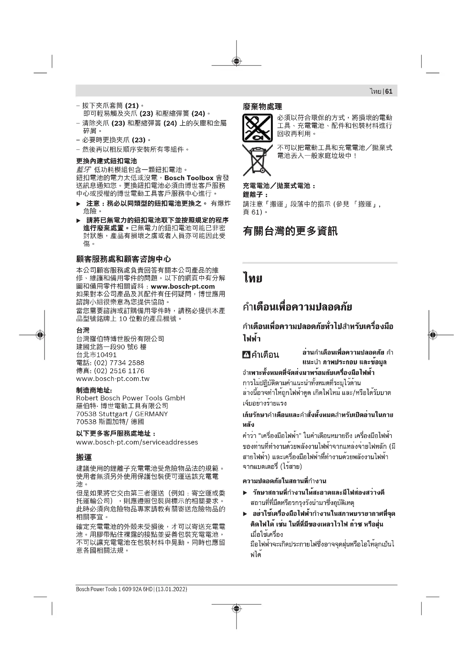 Low Energy Module มีถ่านกระดุม หากแบตเตอรี่กระดุอ่อนหรือหมดประจุ จะได้รับการแจ้งเตือน ผ่าน Bosch Toolbox การเปลี่ยนแบตเตอรี่กระดุม ต้อง ดำเนินการโดย Bosch หรือศูนย์บริการลูกค้าที่ได้รับอนุญาต สำหรับเครื่องมือไฟฟ้าของ Bosch u โปรดทราบ: ต้อเปลี่ยนใช้ถ่านกระดุมประเภทเดียวกัน เสมอ อันตรายจากการระเบิด u นำถ่านกระดุมที่หมดไฟแล้วออกมา และนำไปกำจัด อย่างถูกต้อง ถ่านกระดุมที่หมดไฟแล้วอาจรั่วไหล และส่ง ผลเสียหายต่อผลิตภัณฑ์หรือทำให้บุคคลบาดเจ็บได้ การบริการหลังการขายและการให้คำปรึกษาการ