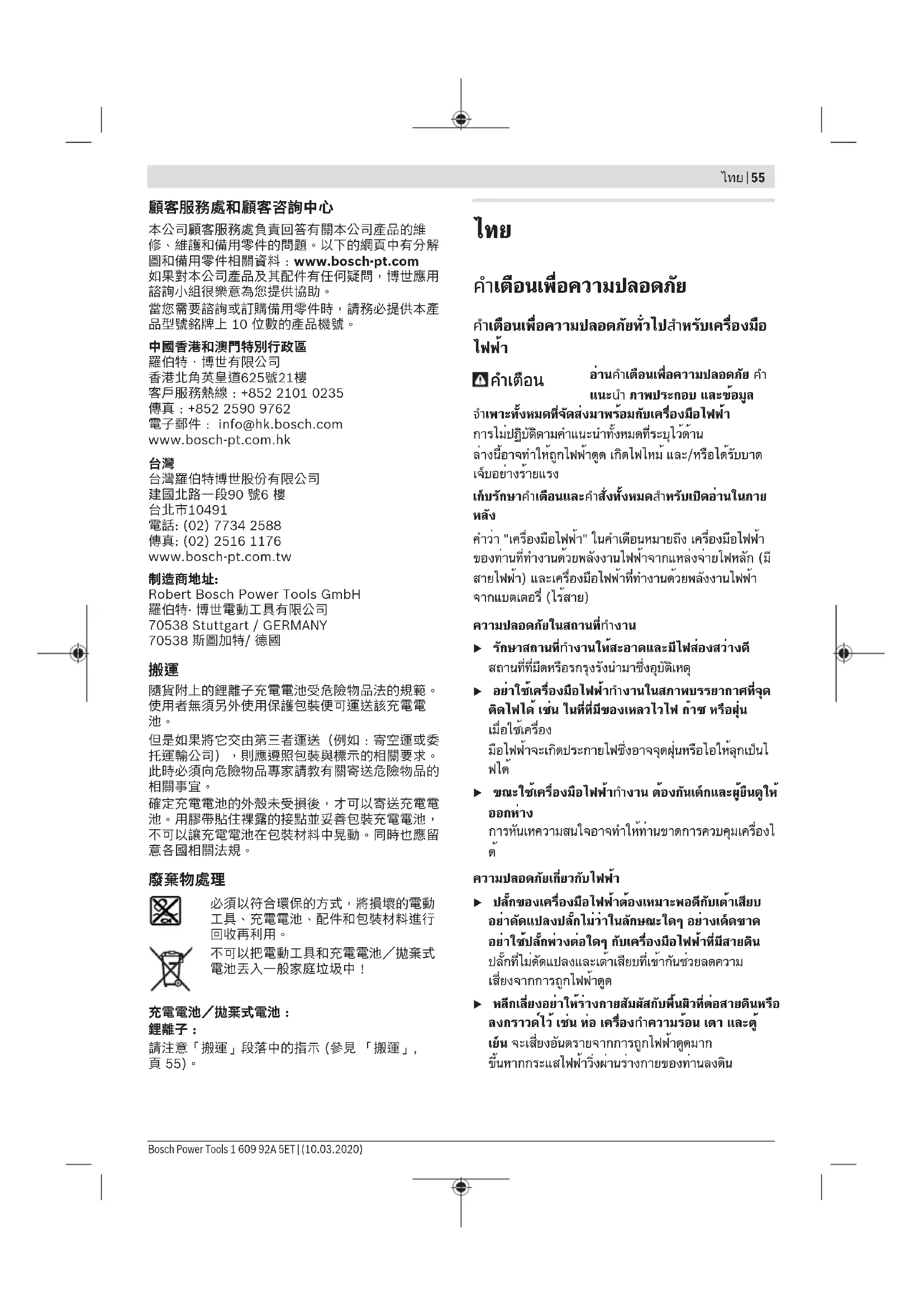 u รอให้เครื่องมือไฟฟ้าหยุดสนิทก่อนวางเครื่องลงบนพื้น เครื่องมือที่ใส่อยู่อาจติดขัดและทำให้สูญเสียการ ควบคุมเครื่องมือไฟฟ้า Bosch Power Tools 1 609 92A 5ET | (10.03.2020)58 | ไทย u เมื่อแบตเตอรี่ชำรุดและนำไปใช้งานอย่างไม่ถูกต้อง อาจมีไอระเหยออกมาได้ แบตเตอรี่อาจเผาไหม้หรือ ระเบิดได้ให้สูดอากาศบริสุทธิ์และไปพบแพทย์ในกรณีเจ็บ ปวด ไอระเหยอาจทำให้ระบบหายใจระคายเคือง u อย่าเปิดแบตเตอรี่ อันตรายจากการลัดวงจรu วัตถุที่แหลมคม ต. ย. เช่น ตะปูหรือไขควง หรือแรง กระทำภายนอก อาจทำให้แบตเตอรี่เสียหายได้ สิ่งเหล่า นี้อาจทำให้เกิดการลัดวงจรภายในและแบตเตอรี่ไหม้ มี ควัน ระเบิด หรือร้อนเกินไป u ใช้แบตเตอรี่แพ็คเฉพาะในผลิตภัณฑ์ของผู้ผลิตเท่านั้น ในลักษณะนี้ แบตเตอรี่แพ็คจะได้รับการปกป้องจากการใช้ งานเกินกำลังซึ่งเป็นอันตราย ปกป้องแบตเตอรี่จากความร้อน รวมทั้ง ต. ย. เช่น จากการถูกแสงแดดส่องต่อเนื่อง จากไฟ สิ่งสกปรก น้ำ และความชื้น อันตรายจากการ ระเบิดและการลัดวงจร u ปิดสวิทช์เครื่องมือไฟฟ้าทันทีหากเครื่องมือติดขัด ให้ เตรียมพร้อมสำหรับปฏิกิริยาแรงบิดสูงซึ่งเป็นเหตุให้ เกิดการตีกลับ เครื่องมือจะติดขัดเมื่อเครื่องมือไฟฟ้าถูกใช้ งานเกินกำลังหรือเครื่องมือถูกบีบอัดอยู่ในชิ้นงาน รายละเอียดผลิตภัณฑ์และข้อมูล