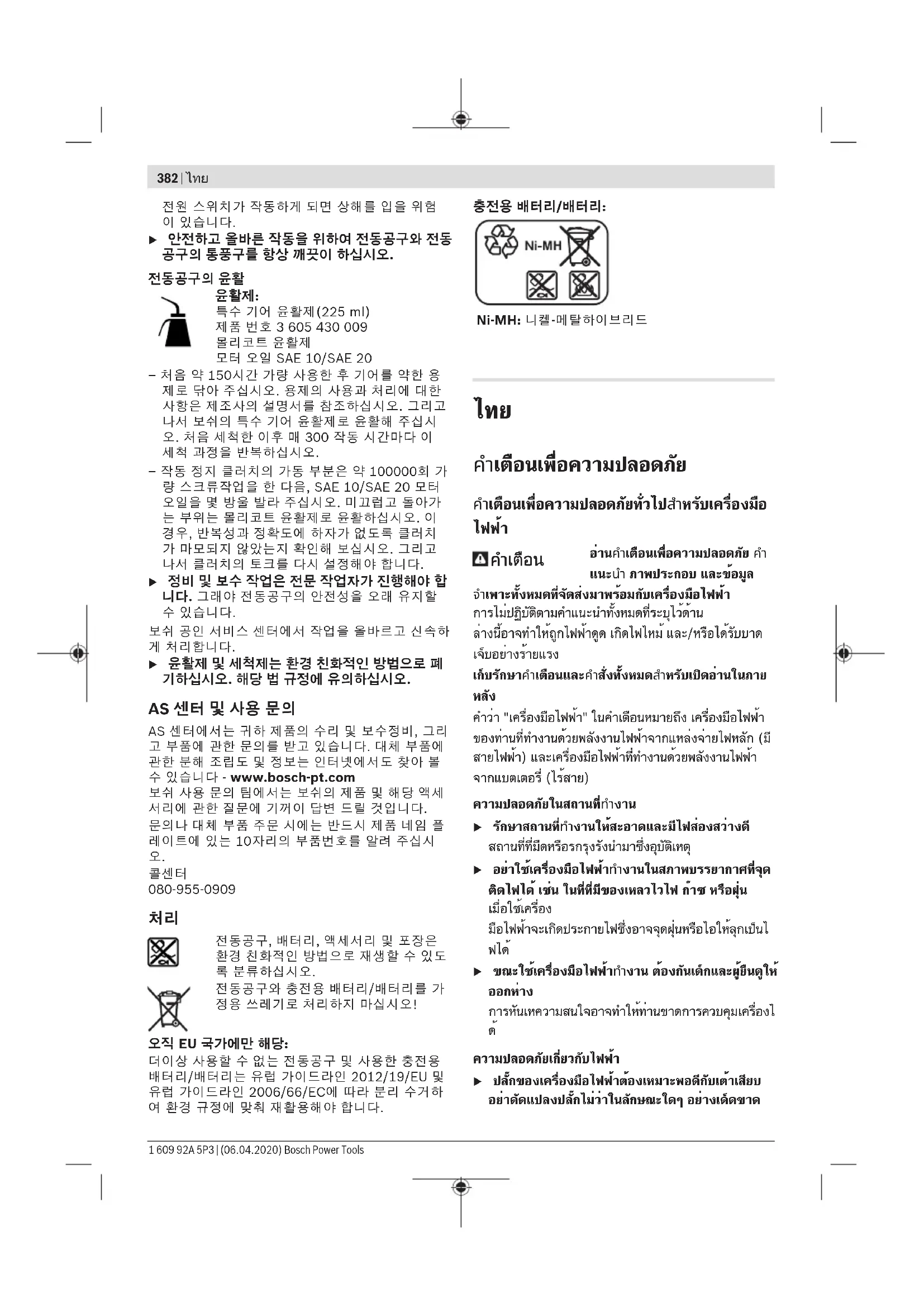 u ส่งเครื่องให้ช่างผู้เชี่ยวชาญทำการบำรุงรักษาและ ซ่อมแซมเท่านั้น ในลักษณะนี้ท่านจะแน่ใจได้ว่าเครื่องมือ ไฟฟ้ายังคงอยู่ในสภาพที่ปลอดภัย ศูนย์บริการลูกค้า บ๊อช ที่ได้รับมอบหมายสามารถทำงานนี้ได้ อย่างรวดเร็วและเชื่อถือได้ u กำจัดสารหล่อลื่นและสารทำความสะอาดในลักษณะที่ เป็นมิตรต่อสิ่งแวดล้อม ปฏิบัติตามข้อบังคับทาง