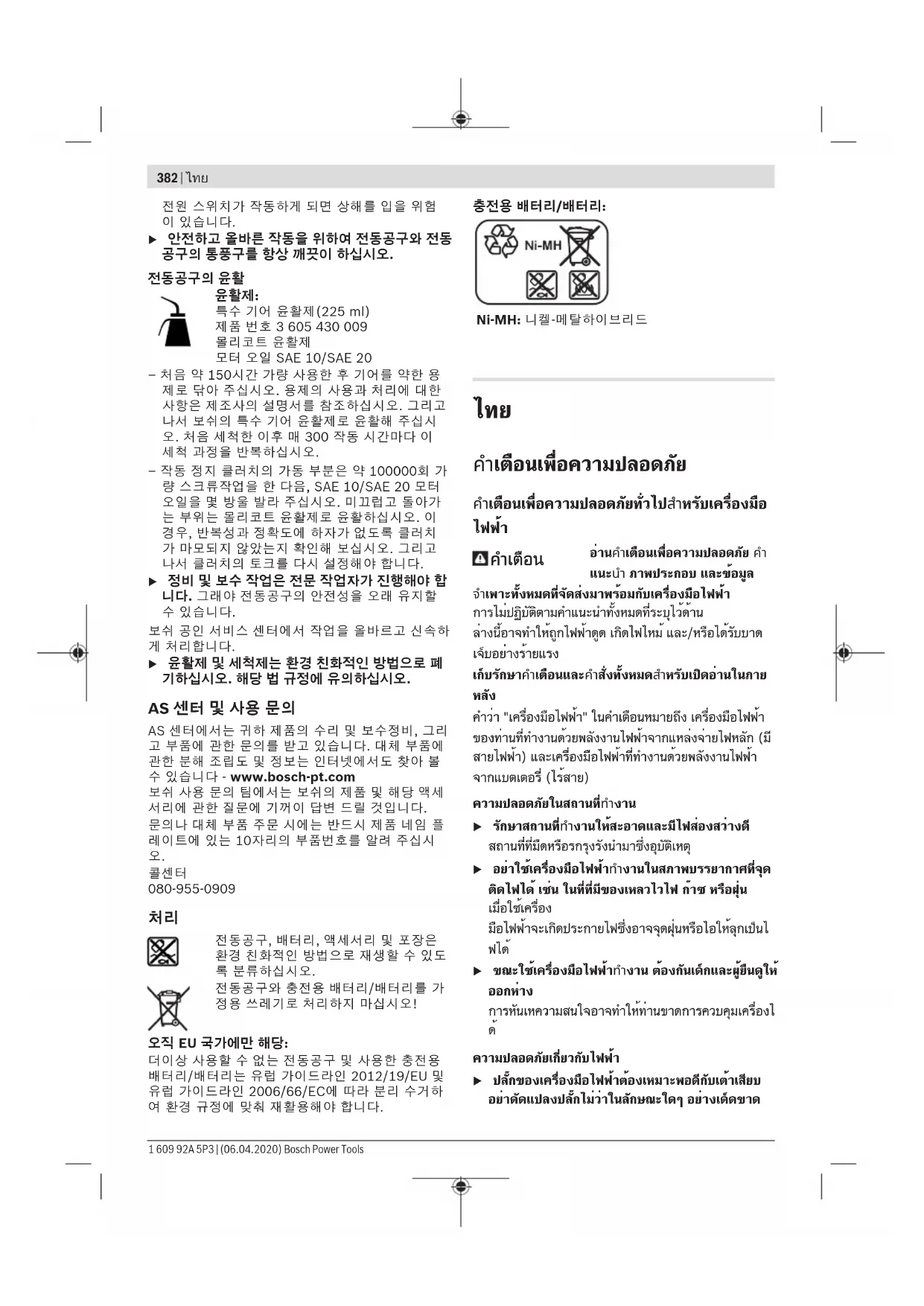 u ส่งเครื่องให้ช่างผู้เชี่ยวชาญทำการบำรุงรักษาและ ซ่อมแซมเท่านั้น ในลักษณะนี้ท่านจะแน่ใจได้ว่าเครื่องมือ ไฟฟ้ายังคงอยู่ในสภาพที่ปลอดภัย ศูนย์บริการลูกค้า บ๊อช ที่ได้รับมอบหมายสามารถทำงานนี้ได้ อย่างรวดเร็วและเชื่อถือได้ u กำจัดสารหล่อลื่นและสารทำความสะอาดในลักษณะที่ เป็นมิตรต่อสิ่งแวดล้อม ปฏิบัติตามข้อบังคับทาง