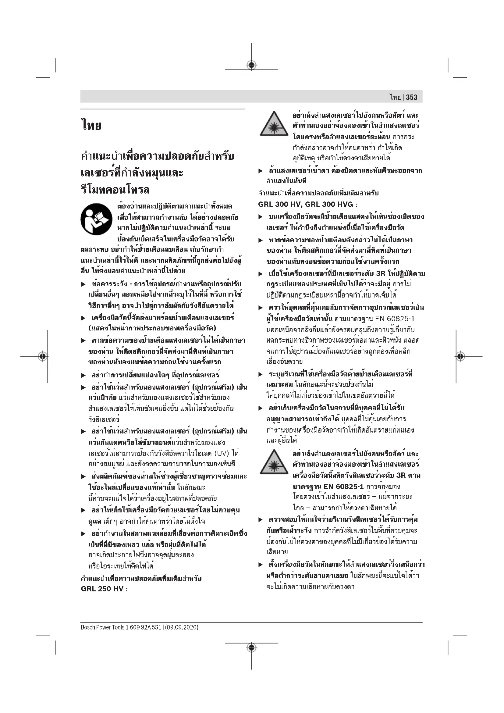 คำแนะนำเพื่อความปลอดภัยสำหรับ เลเซอร์ที่กำลังหมุนและ รีโมทคอนโทรล ต้องอ่านและปฏิบัติตามคำแนะนำทั้งหมด เพื่อให้สามารถทำงานกับ ได้อย่างปลอดภัย หากไม่ปฏิบัติตามคำแนะนำเหล่านี้ ระบบ ป้องกันเบ็ดเสร็จในเครื่องมือวัดอาจได้รับ ผลกระทบ อย่าทำให้ป้ายเตือนลบเลือน เก็บรักษาคำ แนะนำเหล่านี้ไว้ให้ดี และหากผลิตภัณฑ์นี้ถูกส่งต่อไปยังผู้ อื่น ให้ส่งมอบคำแนะนำเหล่านี้ไปด้วย u ข้อควรระวัง - การใช้อุปกรณ์ทำงานหรืออุปกรณ์ปรับ เปลี่ยนอื่นๆ นอกเหนือไปจากที่ระบุไว้ในที่นี้ หรือการใช้ วิธีการอื่นๆ อาจนำไปสู่การสัมผัสกับรังสีอันตรายได้ u เครื่องมือวัดนี้จัดส่งมาพร้อมป้ายเตือนแสงเลเซอร์ (แสดงในหน้าภาพประกอบของเครื่องมือวัด) u หากข้อความของป้ายเตือนแสงเลเซอร์ไม่ได้เป็นภาษา ของท่าน ให้ติดสติกเกอร์ที่จัดส่งมาที่พิมพ์เป็นภาษา ของท่านทับลงบนข้อความก่อนใช้งานครั้งแรก u อย่าทำการเปลี่ยนแปลงใดๆ ที่อุปกรณ์เลเซอร์ u อย่าใช้แว่นสำหรับมองแสงเลเซอร์ (อุปกรณ์เสริม) เป็น แว่นนิรภัย แว่นสำหรับมองแสงเลเซอร์ใช้สำหรับมอง ลำแสงเลเซอร์ให้เห็นชัดเจนยิ่งขึ้น แต่ไม่ได้ช่วยป้องกัน รังสีเลเซอร์ u อย่าใช้แว่นสำหรับมองแสงเลเซอร์ (อุปกรณ์เสริม) เป็น แว่นกันแดดหรือใส่ขับรถยนต์แว่นสำหรับมองแสง เลเซอร์ไม่สามารถป้องกันรังสีอัลตราไวโอเลต (UV) ได้ อย่างสมบูรณ์ และยังลดความสามารถในการมองเห็นสี u ส่งผลิตภัณฑ์ของท่านให้ช่างผู้เชี่ยวชาญตรวจซ่อมและ ใช้อะไหล่เปลี่ยนของแท้เท่านั้น ในลักษณะ นี้ท่านจะแน่ใจได้ว่าเครื่องอยู่ในสภาพที่ปลอดภัย u อย่าให้เด็กใช้เครื่องมือวัดด้วยเลเซอร์โดยไม่ควบคุม ดูแล เด็กๆ อาจทำให้คนตาพร่าโดยไม่ตั้งใจ u อย่าทำงานในสภาพแวดล้อมที่เสี่ยงต่อการติดระเบิดซึ่ง เป็นที่ที่มีของเหลว แก๊ส หรือฝุ่นที่ติดไฟได้ อาจเกิดประกายไฟซึ่งอาจจุดฝุ่นละออง หรือไอระเหยให้ติดไฟได้ คำแนะนำเพื่อความปลอดภัยเพิ่มเติมสำหรับ GRL250HV : อย่าเล็งลำแสงเลเซอร์ไปยังคนหรือสัตว์ และ ตัวท่านเองอย่าจ้องมองเข้าในลำแสงเลเซอร์ โดยตรงหรือลำแสงเลเซอร์สะท้อน การกระ ทำดังกล่าวอาจทำให้คนตาพร่า ทำให้เกิด อุบัติเหตุ หรือทำให้ดวงตาเสียหายได้ u ถ้าแสงเลเซอร์เข้าตา ต้องปิดตาและหันศีรษะออกจาก ลำแสงในทันที คำแนะนำเพื่อความปลอดภัยเพิ่มเติมสำหรับ GRL300HV, GRL300HVG : u บนเครื่องมือวัดจะมีป้ายเตือนแสดงให้เห็นช่องเปิดของ เลเซอร์ ให้คำนึงถึงตำแหน่งนี้เมื่อใช้เครื่องมือวัด u หากข้อความของป้ายเตือนดังกล่าวไม่ได้เป็นภาษา ของท่าน ให้ติดสติกเกอร์ที่จัดส่งมาที่พิมพ์เป็นภ