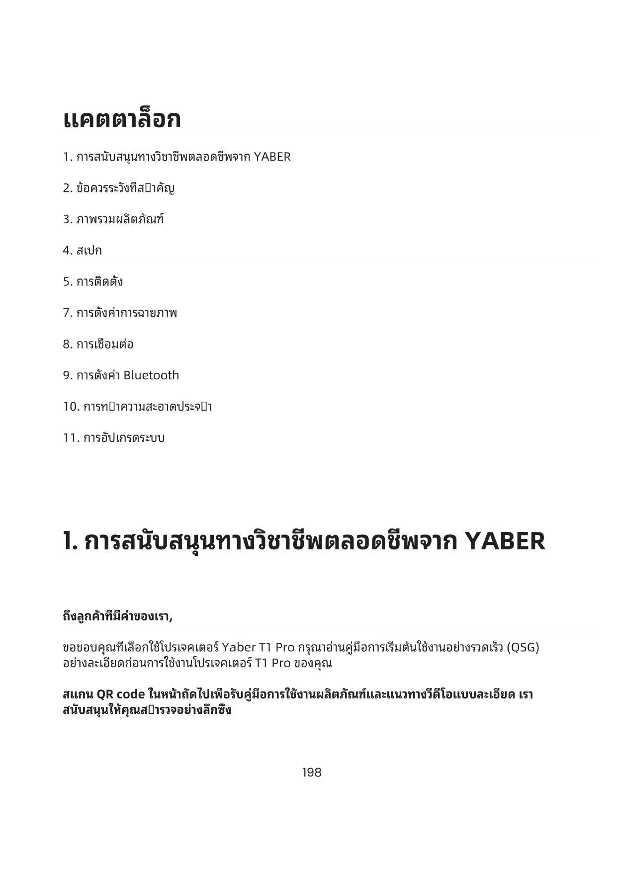 ถึงลูกค้าที่มีค่าของเรา, ขอขอบคุณที่เลือกใช้โปรเจคเตอร์ Yaber T1 Pro กรุณาอ่านคู่มือการเริ่มต้นใช้งานอย่างรวดเร็ว (QSG) อย่างละเอียดก่อนการใช้งานโปรเจคเตอร์ T1 Pro ของคุณ สแกน QR code ในหน้าถัดไปเพื่อรับคู่มือการใช้งานผลิตภัณฑ์และแนวทางวีดีโอแบบละเอียด เรา สนับสนุนให้คุณสำรวจอย่างลึกซึ้ง