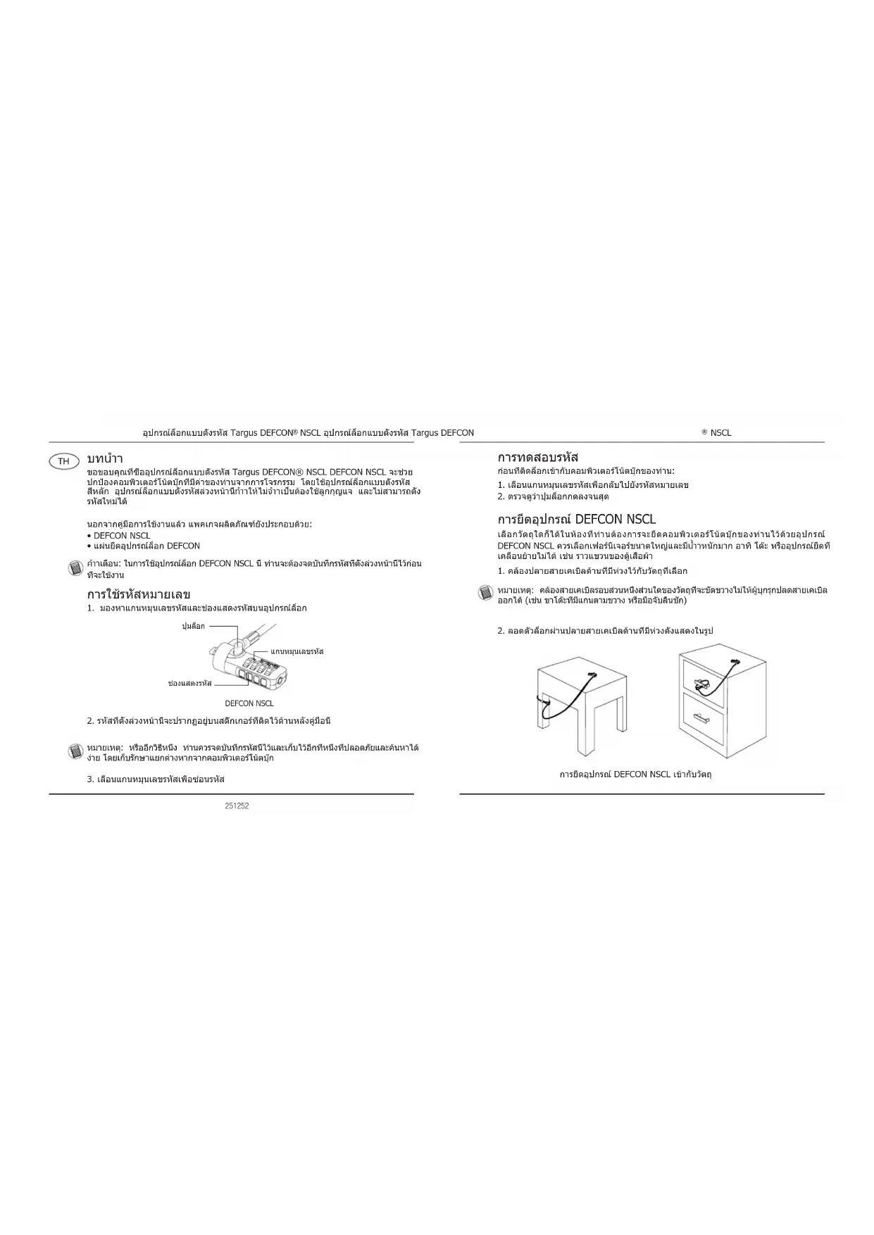 NSCL กรใข้รหัสหมยเลขของท่น Targus ไม่มีส่วนรับผิดชอบต่อกรสูญเสีย กรวงตำแหน่งผิด หรือกรลืมรหัส โปรดเก็บ รักษข้อมูลนี้ไว้ในสถนที่ปลอดภัยและ/หรือจัดเก็บรหัสหมยเลขนี้ไว้ในระบบอิเล็กทรอนิกส์ ในสถนที่ปลอดภัยซึ่งอยู่ห่งจกคอมพิวเตอร์โน้ตบุ๊กของท่น นี่คือรหัสของท่น โปรดดูที่หน้หลัง259 260 folding line 2 staples here (saddle stitching) folding line 2 staples here (saddle stitching) Open size: 9”W x 4.5”H Folded Size: 4.5”W x 4.5”H Material: 80gsm woodfree paper Color: Grayscale Diecut Targus DEFCON