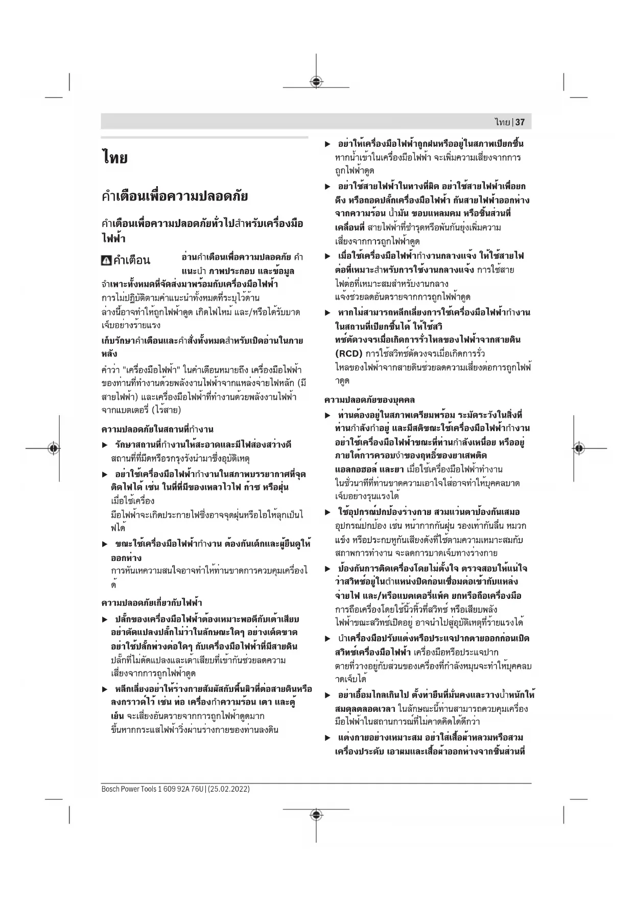 u อย่าเอื้อมไกลเกินไป ตั้งท่ายืนที่มั่นคงและวางน้ำหนักให้ สมดุลตลอดเวลา ในลักษณะนี้ท่านสามารถควบคุมเครื่อง มือไฟฟ้าในสถานการณ์ที่ไม่คาดคิดได้ดีกว่า u แต่งกายอย่างเหมาะสม อย่าใส่เสื้อผ้าหลวมหรือสวม เครื่องประดับ เอาผมและเสื้อผ้าออกห่างจากชิ้นส่วนที่ Bosch Power Tools 1 609 92A 76U | (25.02.2022)38 | ไทย เคลื่อนที่ เสื้อผ้าหลวม เครื่องประดับ และผม ยาวอาจเข้าไปติดในชิ้นส่วนที่เคลื่อนที่ u หากเครื่องมือไฟฟ้ามีข้อเชื่อมต่อกับเครื่องดูดฝุ่นหรือ เครื่องเก็บผง ให้ตรวจสอบให้แน่ใจว่าได้เชื่อมต่อและ ใช้งานอย่างถูกต้อง การใช้อุปกรณ์ดูด ฝุ่นช่วยลดอันตรายที่เกิดจากฝุ่นได้ u เมื่อใช้งานเครื่องบ่อยครั้งจะเกิดความคุ้นเคย อย่าให้ ความคุ้นเคยทำให้ท่านเกิดความชะล่าใจและละเลยกฎ เกณฑ์ด้านความปลอดภัยในการใช้งานเครื่อง การ ทำงานอย่างไม่ระมัดระวังอาจทำให้เกิดการบาด เจ็บอย่างร้ายแรงภายในเสี้ยววินาที การใช้และการดูแลรักษาเครื่องมือไฟฟ้า u อย่างฝืนกำลังเครื่องมือไฟฟ้า ใช้เครื่องมือไฟฟ้าที่ถูก ต้องตรงตามลักษณะงานของท่าน เครื่องมือไฟฟ้าที่ถูก ต้องจะทำงานได้ดี กว่าและปลอดภัยกว่าในระดับสมรรถภาพที่ออกแบบไว้ u อย่าใช้เครื่องมือไฟฟ้าถ้าสวิทช์ไม่สามารถเปิดปิดได้ เครื่องมือไฟฟ้าที่ไม่สามารถควบคุมการเปิดปิดด้วยสวิ ทช์ได้ เป็นเครื่อง มือไฟฟ้าที่ไม่ปลอดภัยและต้องส่งซ่อมแซม u ก่อนปรับแต่งเครื่อง เปลี่ยนอุปกรณ์ประกอบ หรือเก็บ เครื่องเข้าที่ ต้องถอดปลั๊กออกจากแหล่งจ่ายไฟ และ/ หรือถอดแบตเตอรี่แพ็คออกจากเครื่องมือไฟฟ้าหาก