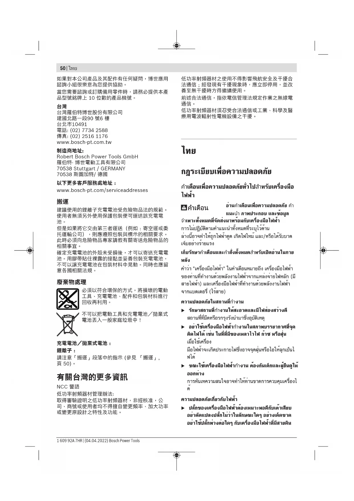 Bosch Power Tools 1 609 92A 7HR | (04.04.2022)52 | ไทย u รักษาเครื่องมือตัดให้คมและสะอาด หากบำรุงรักษาเครื่องมือที่มีขอบตัดแหลมคมอย่างถูกต้อง จะสามารถตัดได้ลื่นไม่ติดขัดและควบคุมได้ง่ายกว่า u ใช้เครื่องมือไฟฟ้า อุปกรณ์ประกอบ เครื่องมือ และอุปก รณ์อื่นๆ ตรงตามคำแนะนำเหล่านี้ โดยคำนึงถึง เงื่อนไขการทำงานและงานที่จะทำ การใช้เครื่อง มือไฟฟ้าทำงานที่ต่างไปจากวัตถุประสงค์การ ใช้งานของเครื่อง อาจนำไปสู่สถานการณ์ที่เป็นอันตรายได้ u ดูแลด้ามจับและพื้นผิวจับให้แห้ง สะอาด และปราศจาก คราบน้ำมันและจาระบี ด้ามจับและพื้นผิว จับที่ลื่นทำให้หยิบจับได้ไม่ปลอดภัย และไม่สามารถควบคุมเครื่องมือในสถานการณ์ที่ไม่คาดคิด การใช้และการดูแลรักษาเครื่องที่ใช้แบตเตอรี่ u ชาร์จไฟใหม่ด้วยเครื่องชาร์จที่บริษัทผู้ผลิตระบุไว้