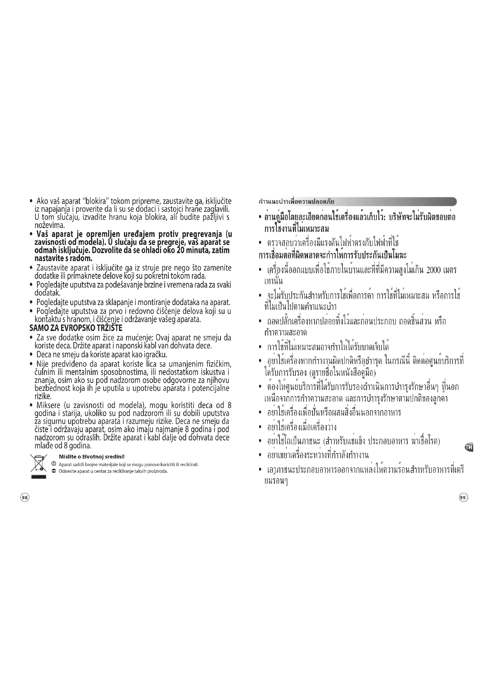 - หากเครื่อง “หยุดทำางาน” ระหว่างการเตรียมอาหาร หยุดเครื่อง ถอดปลั๊ก แล้วตรวจสอบว่าเครื่องที่ใช้ติดขัดหรือไม่ ในกรณีนี้ เอาอาหารที่ติดออก โดยใช้ใบมีด ดำาเนินการอย่างระมัดระวัง