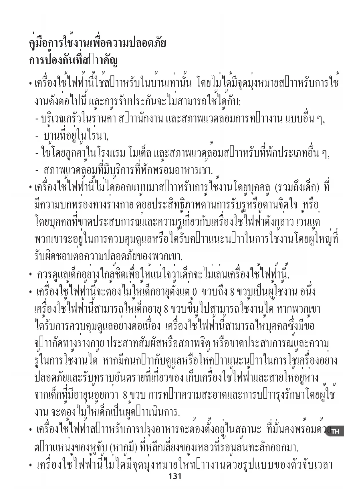 - เครื่องใช้ไฟฟ้านี้จะต้องไม่ให้เด็กอายุตั้งแต่ 0 ขวบถึง 8 ขวบเป็นผู้ใช้งาน อนึ่ง เครื่องใช้ไฟฟ้านี้สามารถให้เด็กอายุ 8 ขวบขึ้นไปสามารถใช้งานได้ หากพวกเขา ได้รับการควบคุมดูแลอย่างต่อเนื่อง เครื่องใช้ไฟฟ้านี้สามารถให้บุคคลซึ่งมีข้อ จำากัดทางร่างกาย ประสาทสัมผัสหรือสภาพจิต หรือขาดประสบการณ์และความ รู้ในการใช้งานได้ หากมีคนกำากับดูแลหรือให้คำาแนะนำาในการใช้เครื่องอย่าง ปลอดภัยและรับทราบอันตรายที่เกี่ยวข้อง เก็บเครื่องใช้ไฟฟ้าและสายให้อยู่ห่าง จากเด็กที่มีอายุน้อยกว่า 8 ขวบ การทำาความสะอาดและการบำารุงรักษาโดยผู้ใช้ งาน จะต้องไม่ให้เด็กเป็นผู้ดำาเนินการ.