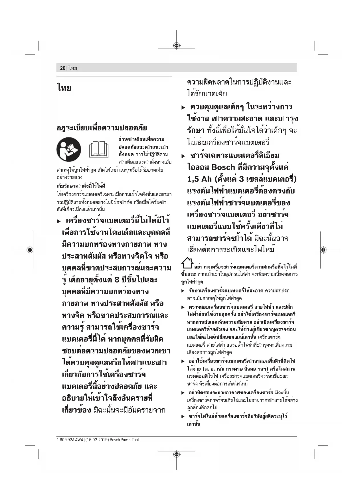1 609 92A 4W4 | (15.02.2019) Bosch Power Toolsไทย | 21 เครื่องชาร์จที่เหมาะสำหรับชาร์จแบตเตอรี่แพ็คประเภทหนึ่ ง หากนำไปชาร์จแบตเตอรี่แพ็คประเภทอื่น อาจเกิดไฟ