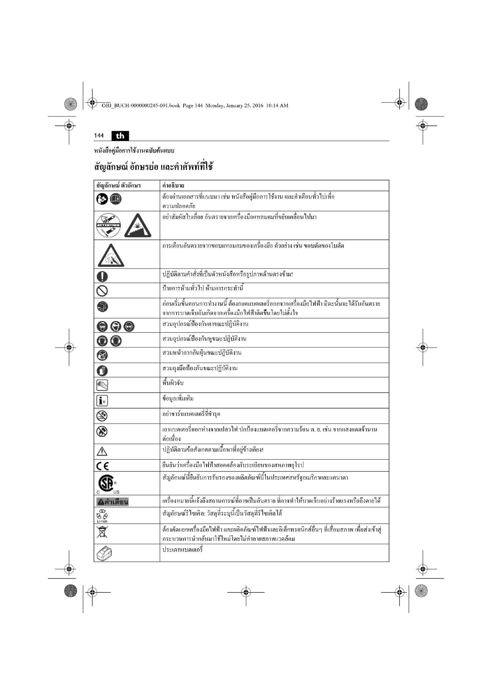ปฏิบัติตามขอสังเกตตามเนื้อหาที่อยูขางเคียง! ยืนยันวาเครื่องมือไฟฟาสอดคลองกับระเบียบของสหภาพยุโรป สัญลักษณนี้ยืนยันการรับรองของผลิตภัณฑนี้ในประเทศสหรัฐอเมริกาและแคนาดา เครื่องหมายนี้แจงถึงสถานการณที่อาจเปนอันตราย ที่อาจทําใหบาดเจ็บอยางรายแรงหรือถึงตายได สัญลักษณรีไซเคิ ล: วัสดุที่ระบุนี้เปนวัสดุท ี่รีไซเคิลได ตองคัดแยกเครื่องมือไฟฟา และผลิตภัณฑไฟฟาและอิเล็กทรอนิกสอื่นๆ ที่เสื่อมสภาพ เพื่อสงเขาสู กระบวนการนํากลับมาใชใหมโดยไมทําลายสภาพแวดล อม ประเภทแบตเตอรี่ OBJ_BUCH-0000000245-001.book Page 144 Monday, January 25, 2016 10:14 AM145