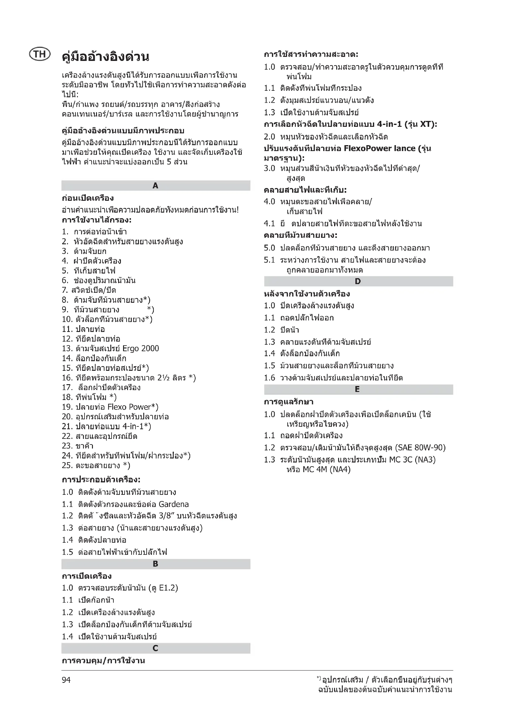 0: ถอดสายยาง HP จากเครื่อง 1: เติมน้ําในท่อดูดและต่อกับเครื่องล้างแรงดันสูง (หมายเลข สินค้า 6400000) 2: ติดตั้งท่อดูดกับที่ยึดสายยางบนปั๊มขาเข้า 3: เปิดสวิตช์ไฟหลักไปที่ ¨I¨ ประมาณสองถึงสามวินาที เปิด และปิดสวิตช์ไฟหลักซ้ํา ๆ ประมาณสองถึงสามครั้ง จนกว่าน้ํา จะออกมาจากปั๊ม 4: ติดตั้งสายยาง HP ด้ามจับสเปรย์และปลายท่อ 5: เปิดสวิตช์ไฟหลักไปที่ ¨I¨ 6: ปลดล็อกด้ามจับสเปรย์และฉีดประมาณสองถึงสามครั้ง จนกว่าน้ําจะออกมาโดยไม่มีอากาศออกมาด้วย ชิ้นส่วนที่จําเป็นสําหรับการดูด หมายเลขสินค้า 1 x หัวอัดฉีดสายยาง 20R 3/4¨ 61369 1 x สายยาง 3/4¨ ความยาวสูงสุด 5 เมตร 1 x ที่ยึดสายยาง 3/4¨ 1 x ตัวกรองที่ดูดพร้อมฟุตวาล์ว 6400000*) อุปกรณ์เสริม / ตัวเลือกขึ้นอยู่กับรุ่นต่างๆ ฉบับแปลของต้นฉบับคําแนะนําการใช้งาน