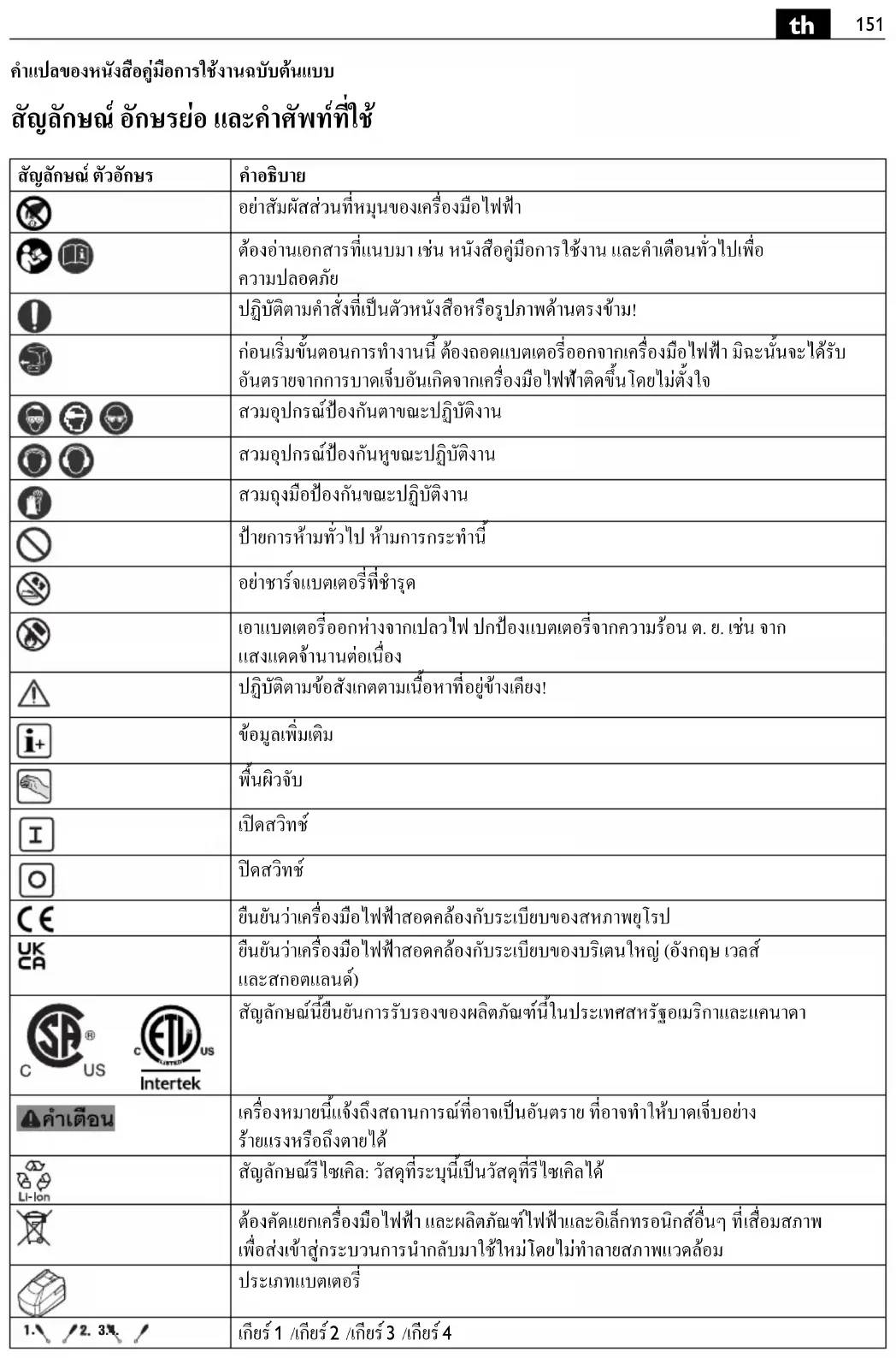 ยืนยันวาเครื่องมือไฟฟาสอดคลองกับระเบียบของสหภาพยุโรป ยืนยันวาเครื่องมือไฟฟาสอดคลองกับระเบียบของบริเตนใหญ (อังกฤษ เวลส และสกอตแลนด) สัญลักษณนี้ยืนยันการรับรองของผลิตภัณฑนี้ในประเทศสหรัฐอเมริกาและแคนาดา เครื่องหมายนี้แจงถึงสถานการณที่อาจเปนอันตราย ที่อาจทําใหบาดเจ็บอยาง รายแรงหรือถึงตายได