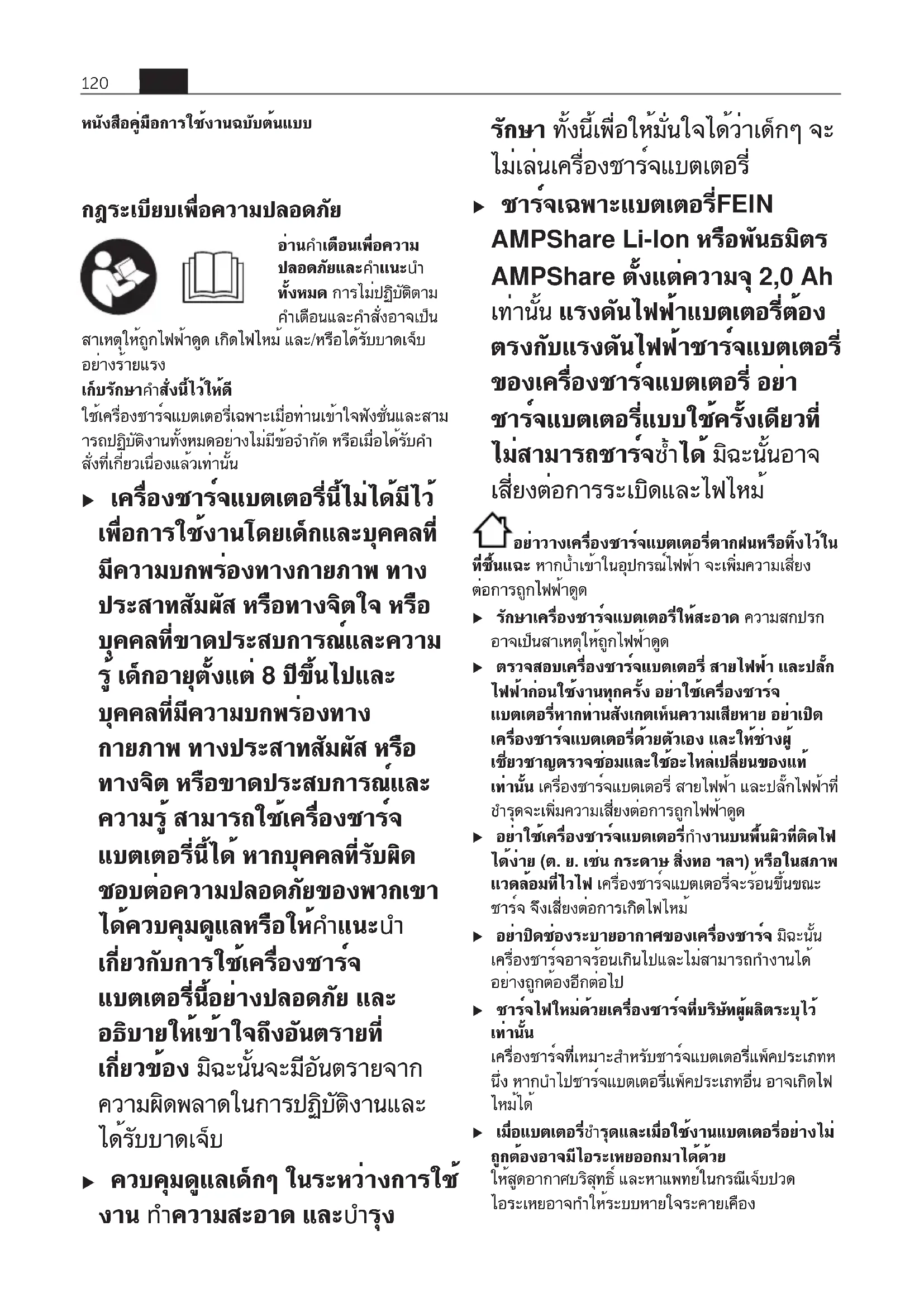 ko 119 34101363060 • 1.6.22หนังสือคู่มือการใช้งานฉบับต้นแบบ กฎระเบียบเพื่อความปลอดภัยไทย อ่านคำเตือนเพื่อความ ปลอดภัยและคำแนะนำ ทั้งหมด การไม่ปฏิบัติตาม คำเตือนและคำสั่งอาจเป็น สาเหตุให้ถูกไฟฟ้าดูด เกิดไฟไหม้ และ/หรือได้รับบาดเจ็บ อย่างร้ายแรง เก็บรักษาคำสั่งนี้ไว้ให้ดี ใช้เครื่องชาร์จแบตเตอรี่เฉพาะเมื่อท่านเข้าใจฟังชั่นและสาม ารถปฏิบัติงานทั้งหมดอย่างไม่มีข้อจำกัด หรือเมื่อได้รับคำ สั่งที่เกี่ยวเนื่องแล้วเท่านั้น u เครื่องชาร์จแบตเตอรี่นี้ไม่ได้มีไว้ เพื่อการใช้งานโดยเด็กและบุคคลที่ มีความบกพร่องทางกายภาพ ทาง ประสาทสัมผัส หรือทางจิตใจ หรือ บุคคลที่ขาดประสบการณ์และความ รู้ เด็กอายุตั้งแต่ 8 ปีขึ้นไปและ บุคคลที่มีความบกพร่องทาง กายภาพ ทางประสาทสัมผัส หรือ ทางจิต หรือขาดประสบการณ์และ ความรู้ สามารถใช้เครื่องชาร์จ แบตเตอรี่นี้ได้ หากบุคคลที่รับผิด ชอบต่อความปลอดภัยของพวกเขา ได้ควบคุมดูแลหรือให้คำแนะนำ เกี่ยวกับการใช้เครื่องชาร์จ แบตเตอรี่นี้อย่างปลอดภัย และ อธิบายให้เข้าใจถึงอันตรายที่ เกี่ยวข้อง มิฉะนั้นจะมีอันตรายจาก ความผิดพลาดในการปฏิบัติงานและ ได้รับบาดเจ็บ u ควบคุมดูแลเด็กๆ ในระหว่างการใช้ งาน ทำความสะอาด และบำรุง รักษา ทั้งนี้เพื่อให้มั่นใจได้ว่าเด็กๆ จะ ไม่เล่นเครื่องชาร์จแบตเตอรี่ u ชาร์จเฉพาะแบตเตอรี่FEIN AMPShare Li-Ion หรือพันธมิตร AMPShare ตั้งแต่ความจุ 2,0Ah เท่านั้น แรงดันไฟฟ้าแบตเตอรี่ต้อง ตรงกับแรงดันไฟฟ้าชาร์จแบตเตอรี่ ของเครื่องชาร์จแบตเตอรี่ อย่า ชาร์จแบตเตอรี่แบบใช้ครั้งเดียวที่ ไม่สามารถชาร์จซ้ำได้ มิฉะนั้นอาจ เสี่ยงต่อการระเบิดและไฟไหม้ อย่าวางเครื่องชาร์จแบตเตอรี่ตากฝนหรือทิ้งไว้ใน ที่ชื้นแฉะ หากน้ำเข้าในอุปกรณ์ไฟฟ้า จะเพิ่มความเสี่ยง ต่อการถูกไฟฟ้าดูด u รักษาเครื่องชาร์จแบตเตอรี่ให้สะอาด ความสกปรก อาจเป็นสาเหตุให้ถูกไฟฟ้าดูด u ตรวจสอบเครื่องชาร์จแบตเตอรี่ สายไฟฟ้า และปลั๊ก ไฟฟ้าก่อนใช้งานทุกครั้ง อย่าใช้เครื่องชาร์จ แบตเตอรี่หากท่านสังเกตเห็นความเสียหาย อย่าเปิด เครื่องชาร์จแบตเตอรี่ด้วยตัวเอง และให้ช่างผู้ เชี่ยวชาญตรวจซ่อมและใช้อะไหล่เปลี่ยนของแท้ เท่านั้น เครื่องชาร์จแบตเตอรี่ สายไฟฟ้า และปลั๊กไฟฟ้าที่ ชำรุดจะเพิ่มความเสี่ยงต่อการถูกไฟฟ้าดูด u อย่าใช้เครื่องชาร์จแบตเตอรี่ทำงานบนพื้นผิวที่ติดไฟ ได้ง่าย (ต. ย. เช่น กระดาษ สิ่งทอ ฯลฯ) หรือในสภาพ แวดล้อมที่ไวไฟ เครื่องชาร์จแบตเตอรี่จะร้อนขึ้นขณะ ชาร์จ จึงเสี่ยงต่อการเกิดไฟไหม้ u อย่าปิดช่องระบายอากาศของเครื่องชาร์จ ม