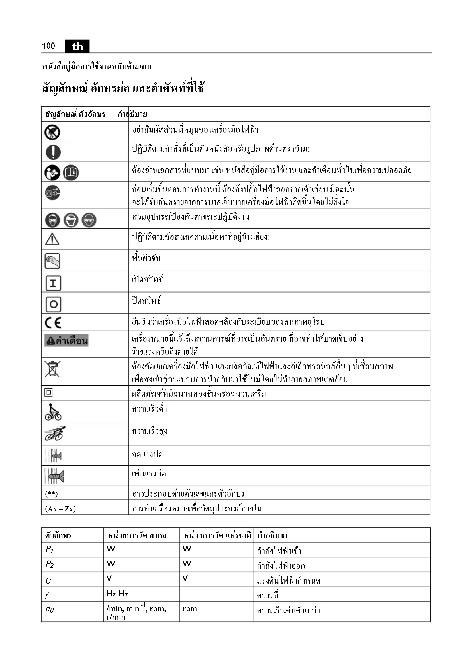 หนังสือคูมือการใชงานฉบับตนแบบ สัญลักษณ อักษรยอ และคําศัพทที่ใช สัญลักษณ ตัวอักษร คําอธิบาย อยาสัมผัสสวนที่หมุนของเครื่องมือไฟฟา ปฏิบัติตามคําสั่งที่เปนตัวหนังสือหรือรูปภาพดานตรงขาม! ตองอานเอกสารที่แนบมา เชน หนังสือคูมือการใชงาน และคําเตือนทั่วไปเพื่อความปลอดภัย กอนเริ่มขั้นตอนการทํางานนี้ ตองดึงปลั๊กไฟฟาออกจากเตาเสียบ มิฉะนั้น จะไดรับอันตรายจากการบาดเจ็บหากเครื่องมือไฟฟาติดขึ้นโดยไมตั้งใจ สวมอุปกรณปองกันตาขณะปฏิบัติงาน ปฏิบัติตามขอสังเกตตามเนื้อหาที่อยูขางเคียง!