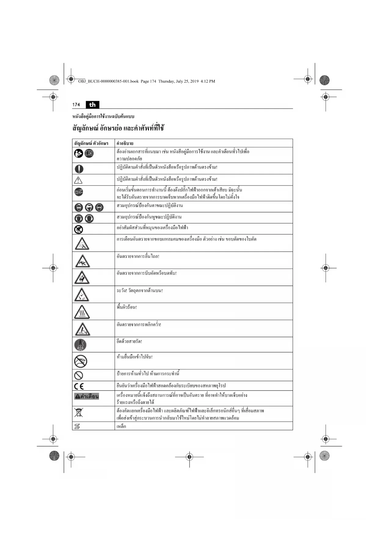 จะไดรับอันตรายจากการบาดเจ็บหากเครื่องมือไฟฟาติดขึ้นโดยไมตั้งใจ สวมอุปกรณปองกันตาขณะปฏิบัติงาน สวมอุปกรณปองกันหูขณะปฏิบัติงาน อยาสัมผัสสวนที่หมุนของเครื่องมือไฟฟา การเตือนอันตรายจากขอบแหลมคมของเครื่องมือ ตัวอยาง เชน ขอบตัดของใบตัด อันตรายจากการลื่นไถล! อันตรายจากการบีบอัดหรือบดทับ! ระวัง! วัตถุตกจากดานบน! พื้นผิวรอน!