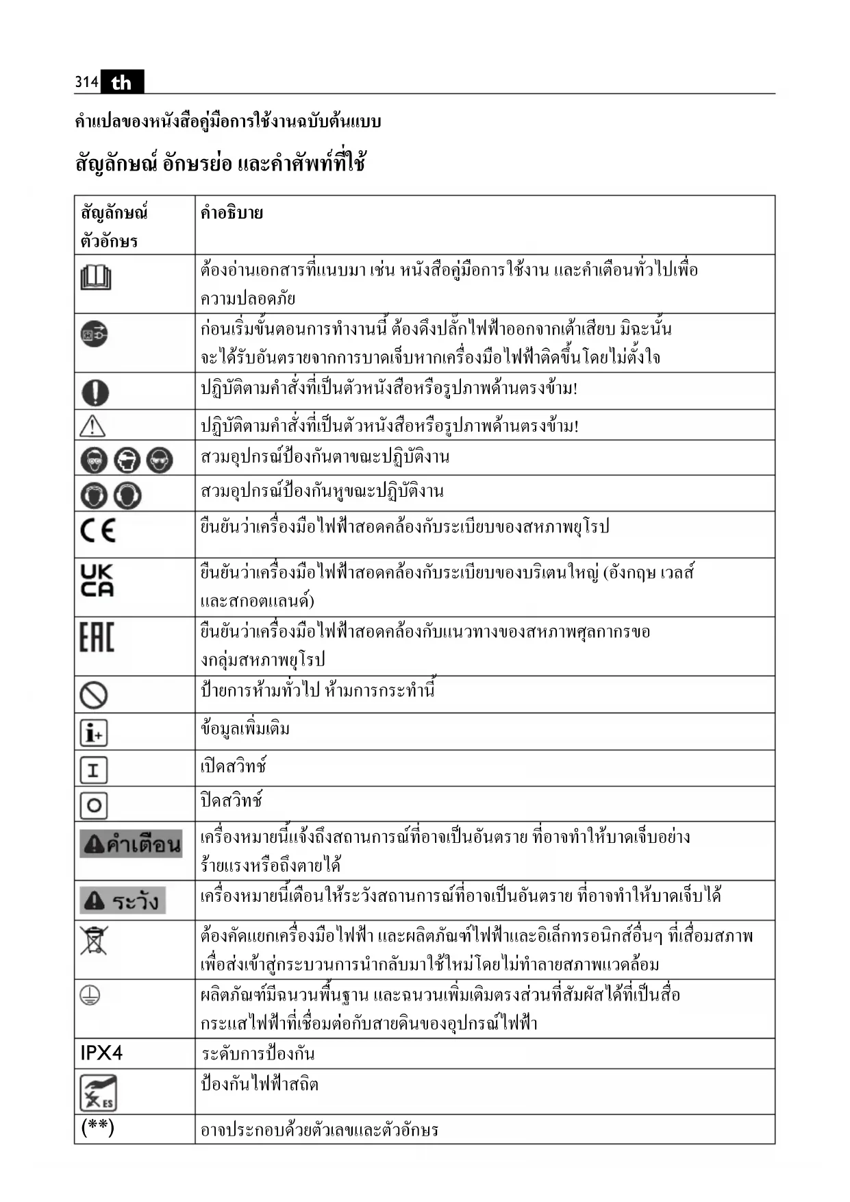 ตองอานเอกสารที่แนบมา เชน หนังสือคูมือการใชงาน และคําเตือนทั่วไปเพื่อ ความปลอดภัย กอนเริ่มขั้นตอนการทํางานนี้ ตองดึงปลั๊กไฟฟาออกจากเตาเสียบ มิฉะนั้น จะไดรับอันตรายจากการบาดเจ็บหากเครื่องมือไฟฟาติดขึ้นโดยไมตั้งใจ ปฏิบัติตามคําสั่งที่เปนตัวหนังสือหรือรูปภาพดานตรงขาม! ปฏิบัติตามคําสั่งที่เปนตั วหนังสือหรือรูปภาพดานตรงขาม! สวมอุปกรณปองกันตาขณะปฏิบัติงาน สวมอุปกรณปองกันหูขณะปฏิบัติงาน ยืนยันวาเครื่องมือไฟฟาสอดคลองกับระเบียบของสหภาพยุโรป ยืนยันวาเครื่องมือไฟฟาสอดคลองกับระเบียบของบริเตนใหญ (อังกฤษ เวลส และสกอตแลนด) ยืนยันวาเครื่องมือไฟฟาสอดคลองกับแนวทางของสหภาพศุลกากรขอ งกลุมสหภาพยุโรป ปายการหามทั่วไป หามการกระทํานี้ ขอมูลเพิ่มเติม