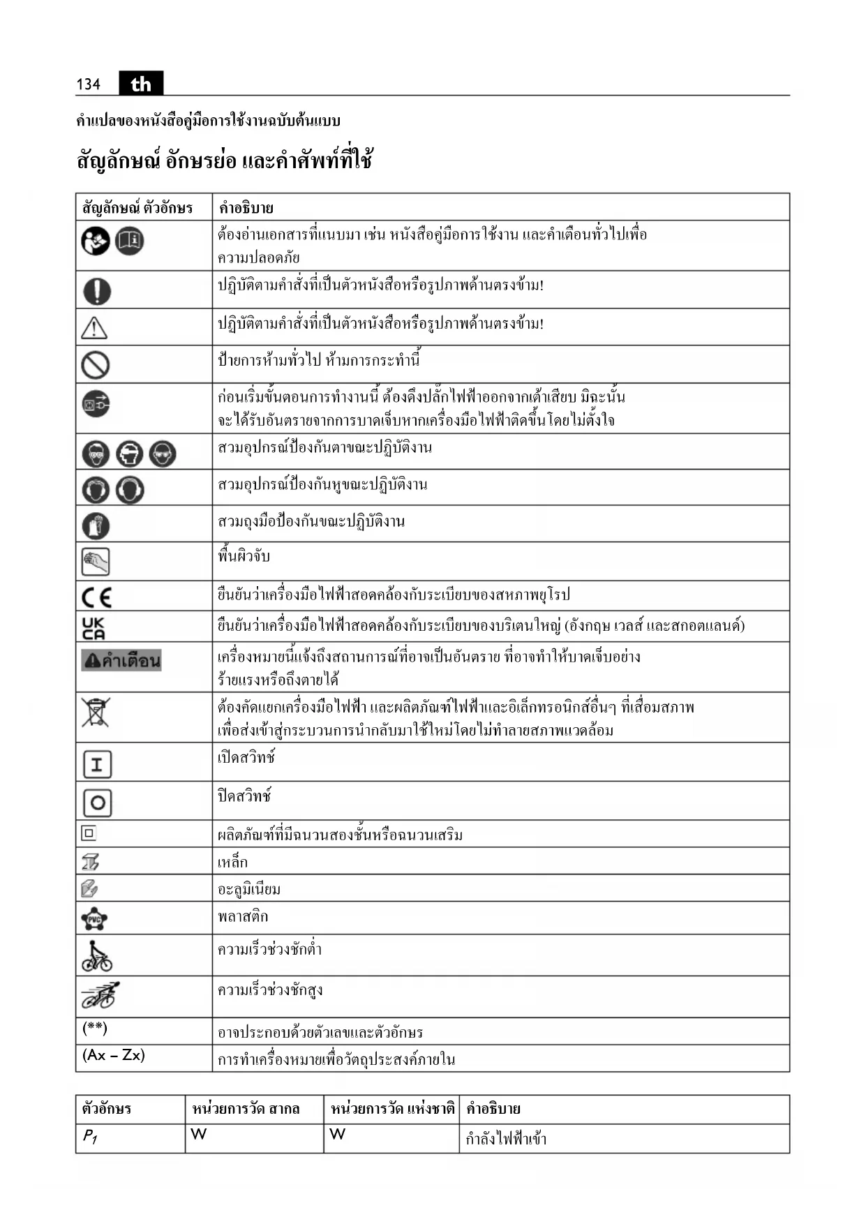 คําแปลของหนังสือคูมือการใชงานฉบับตนแบบ สัญลักษณ อักษรยอ และคําศัพทที่ใช สัญลักษณ ตัวอักษร คําอธิบาย ตองอานเอกสารที่แนบมา เชน หนังสือคูมือการใชงาน และคําเตือนทั่วไปเพื่อ ความปลอดภัย ปฏิบัติตามคําสั่งที่เปนตัวหนังสือหรือรูปภาพดานตรงขาม! ปฏิบัติตามคําสั่งที่เปนตัวหนังสือหรือรูปภาพดานตรงขาม! ปายการหามทั่วไป หามการกระทํานี้ กอนเริ่มขั้นตอนการทํางานนี้ ต องดึงปลั๊กไฟฟาออกจากเตาเสียบ มิฉะนั้น จะไดรับอันตรายจากการบาดเจ็บหากเครื่องมือไฟฟาติดขึ้นโดยไมตั้งใจ สวมอุปกรณปองกันตาขณะปฏิบัติงาน สวมอุปกรณปองกันหูขณะปฏิบัติงาน สวมถุงมือปองกันขณะปฏิบัติงาน