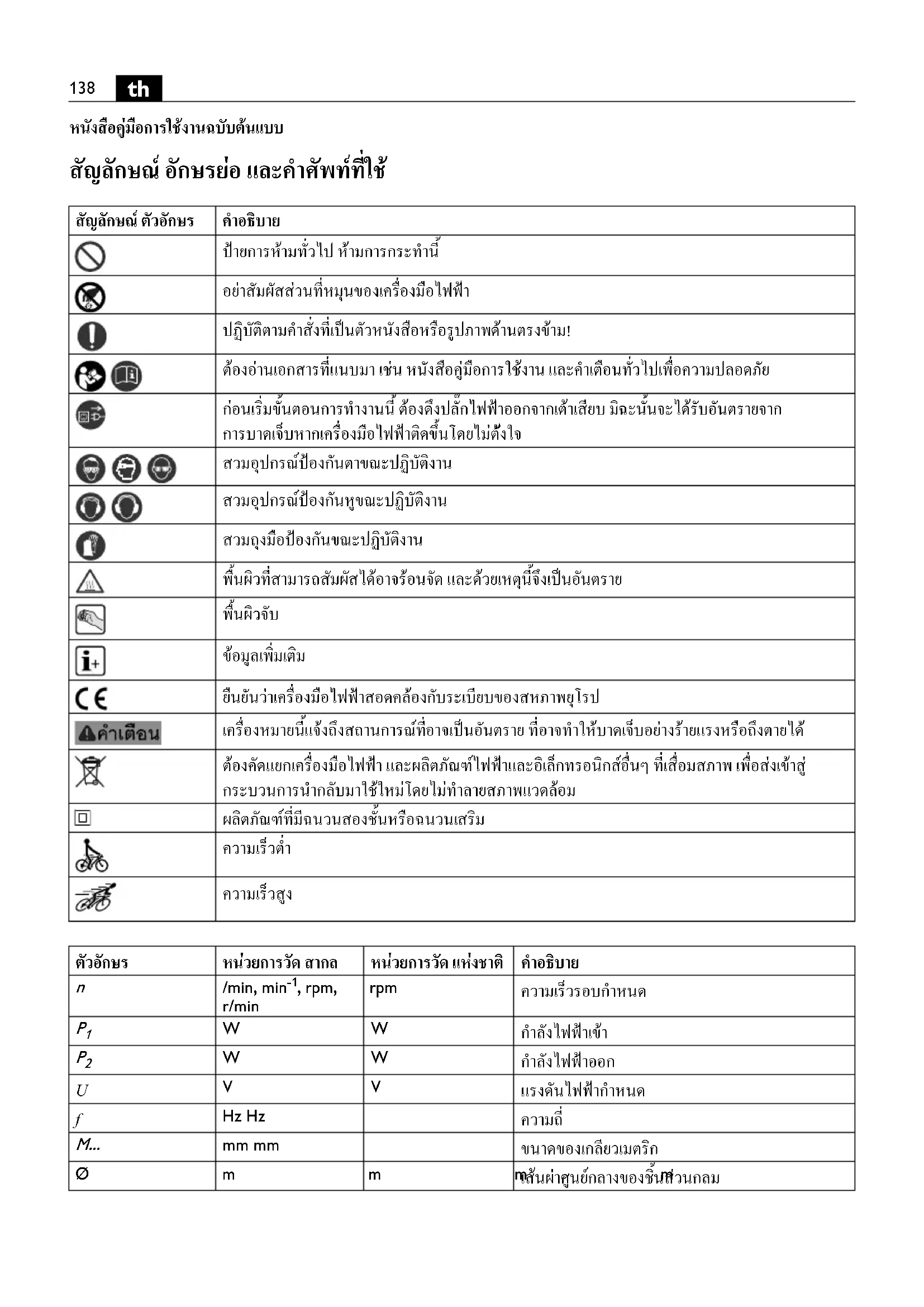 หนังสือคูมือการใชงานฉบับตนแบบ สัญลักษณ อักษรยอ และคําศัพทที่ใช สัญลักษณ ตัวอักษร คําอธิบาย ปายการหามทั่วไป หามการกระทํานี้ อยาสัมผัสสวนที่หมุนของเครื่องมือไฟฟา ปฏิบัติตามคําสั่งที่เปนตัวหนังสือหรือรูปภาพดานตรงขาม! ตองอานเอกสารที่แนบมา เชน หนังสือคูมือการใชงาน และคําเตือนทั่วไปเพื่อความปลอดภัย กอนเริ่มขั้นตอนการทํางานนี้ ตองดึงปลั๊กไฟฟาออกจากเตาเสียบ ม ิฉะนั้นจะไดรับอันตรายจาก การบาดเจ็บหากเครื่องมือไฟฟาติดขึ้นโดยไมตั งใจ สวมอุปกรณปองกันตาขณะปฏิบัติงาน สวมอุปกรณปองกันหูขณะปฏิบัติงาน สวมถุงมือปองกันขณะปฏิบัติงาน พื้นผิวที่สามารถสัมผัสไดอาจรอนจัด และดวยเหตุนี้จึงเปนอันตราย
