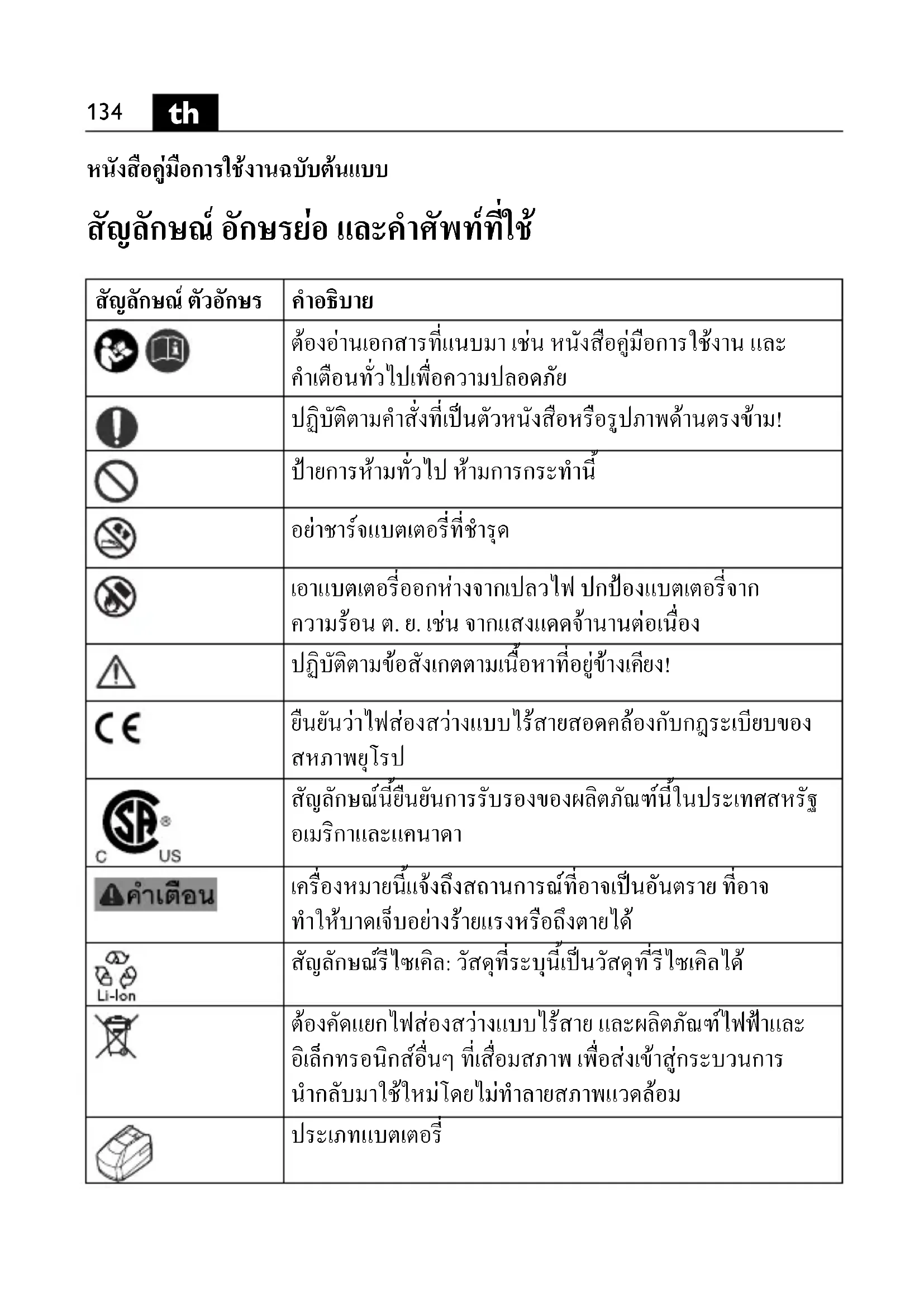 สัญลักษณนี้ยืนยันการรับรองของผลิตภัณฑนี้ในประเทศสหรัฐ อเมริกาและแคนาดา เครื่องหมายนี้แจงถึงสถานการณที่อาจเปนอันตราย ที่อาจ ทําใหบาดเจ็บอยางรายแรงหรือถึงตายได สัญลักษณรีไซเคิล: วัสดุที่ระบุนี้เปนวัสดุท ี่รีไซเคิลได ตองคัดแยกไฟสองสวางแบบไรสาย และผลิตภัณฑไฟฟาและ อิเล็กทรอนิกสอื่นๆ ที่เสื่อมสภาพ เพื่อสงเข าสูกระบวนการ นํากลับมาใชใหมโดยไมทําลายสภาพแวดลอม ประเภทแบตเตอรี่ OBJ_BUCH-0000000215-001.book Page 134 Friday, August 7, 2015 9:31 AM135