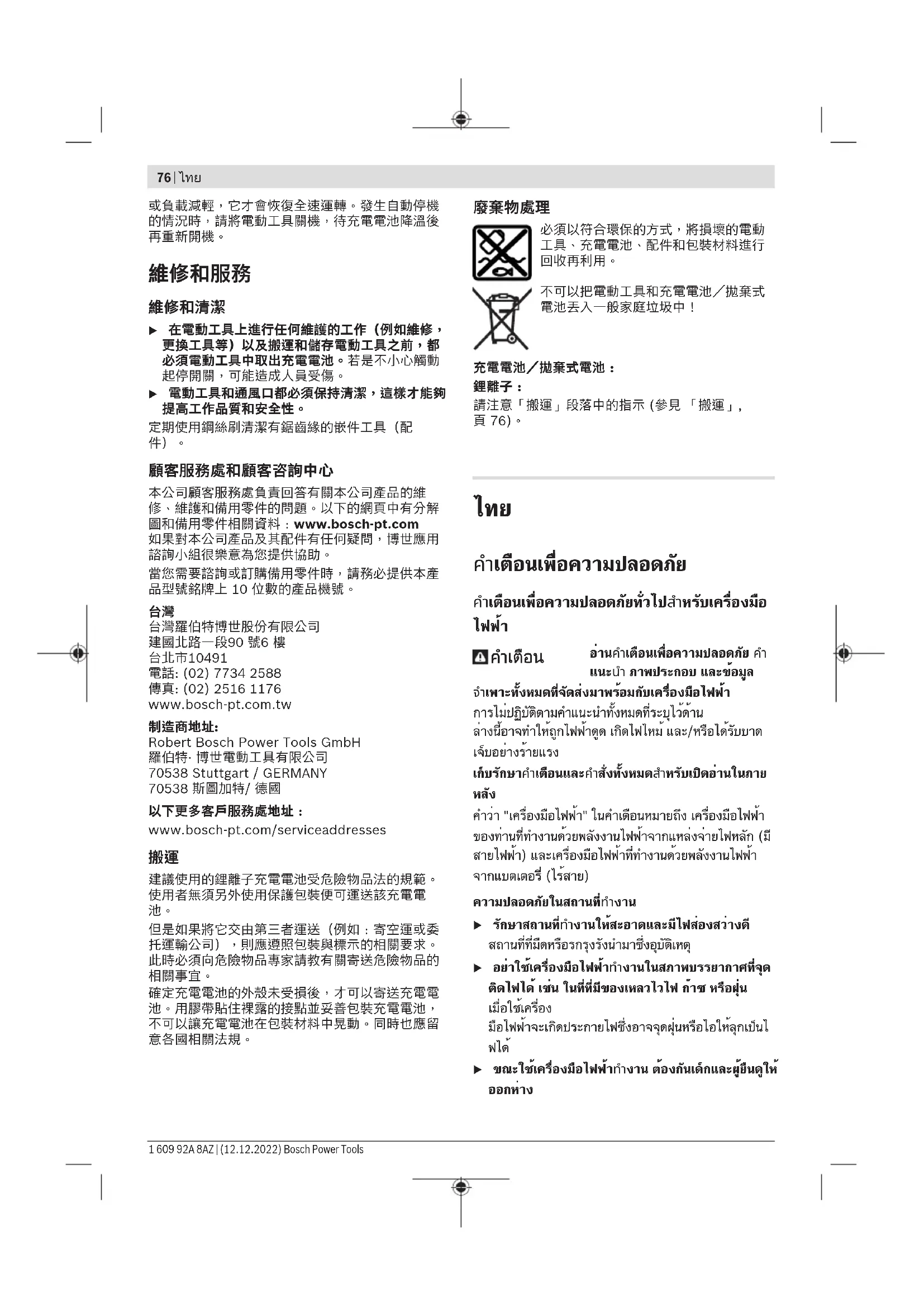 โทรศัพท์ 02 7587555 โทรสาร 02 7587525 สามารถดูที่อยู่ศูนย์บริการอื่นๆ ได้ที่: www.bosch-pt.com/serviceaddresses