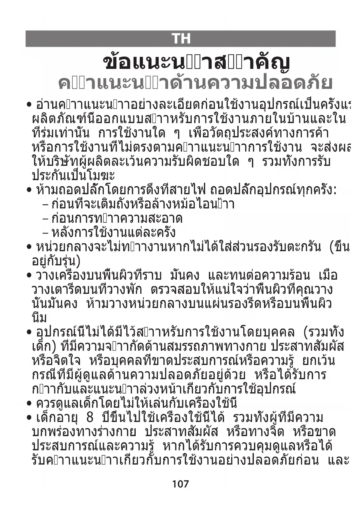 - อุปกรณ์นี้ไม่ได้มีไว้สำาหรับการใช้งานโดยบุคคล (รวมทั้ง เด็ก) ที่มีความจำากัดด้านสมรรถภาพทางกาย ประสาทสัมผัส หรือจิตใจ หรือบุคคลที่ขาดประสบการณ์หรือความรู้ ยกเว้น กรณีที่มีผู้ดูแลด้านความปลอดภัยอยู่ด้วย หรือได้รับการ กำากับและแนะนำาล่วงหน้าเกี่ยวกับการใช้อุปกรณ์