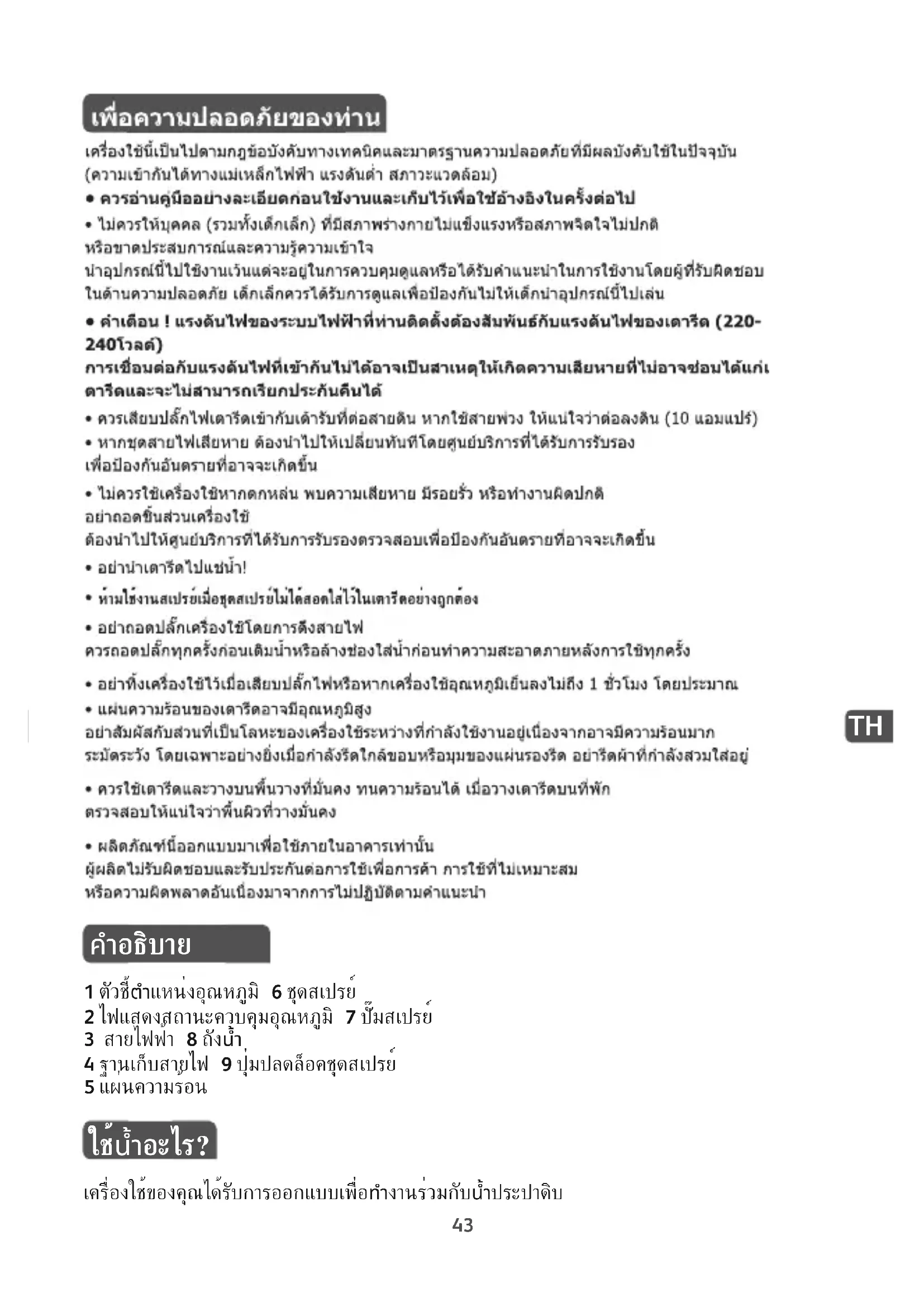 1 ตัวชี้ตำแหน่งอุณหภูมิ 6 ชุดสเปรย์ 2 ไฟแสดงสถานะควบคุมอุณหภูมิ 7 ปั๊มสเปรย์ 3 สายไฟฟ้า 8 ถังน้ำ 4 ฐานเก็บสายไฟ 9 ปุ่มปลดล็อคชุดสเปรย์ 5 แผ่นความร้อน ใช้น้ำอะไร? เครื่องใช้ของคุณได้รับการออกแบบเพื่อทำงานร่วมกับน้ำประปาดิบ 9100013389 FS45XX_110x154 23/05/13 12:33 Page4344 น้ำประเภทไหนที่ใช้ไม่ได้? ประเภทของน้ำที่ระบุไว้ด้านล่างมีแร่ธาตุที่สามารถทำให้เกิดการสึกหรอของเครื่องใช้ก่อนเวลาอันควร: น้ำที่มีกลิ่นหอมหรือน้ำอ่อนและน้ำที่มีสารเติมแต่งไม่ควรนำมาใช้กับเตารีด Tefal ของคุณ