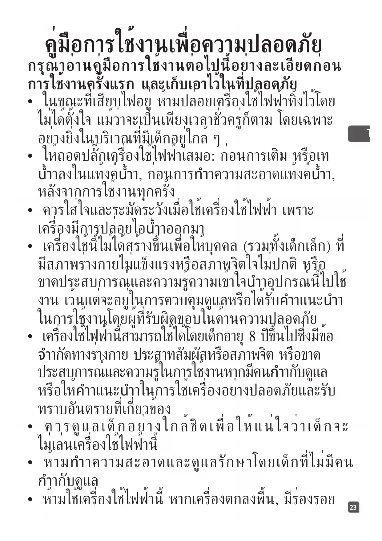 - เครื่องใช้นี้ไม่ได้สร้างขึ้นเพื่อให้บุคคล (รวมทั้งเด็กเล็ก) ที่ มีสภาพร่างกายไม่แข็งแรงหรือสภาพจิตใจไม่ปกติ หรือ ขาดประสบการณ์และความรู้ความเข้าใจนำาอุปกรณ์นี้ไปใช้ งาน เว้นแต่จะอยู่ในการควบคุมดูแลหรือได้รับคำาแนะนำา ในการใช้งานโดยผู้ที่รับผิดขอบในด้านความปลอดภัย