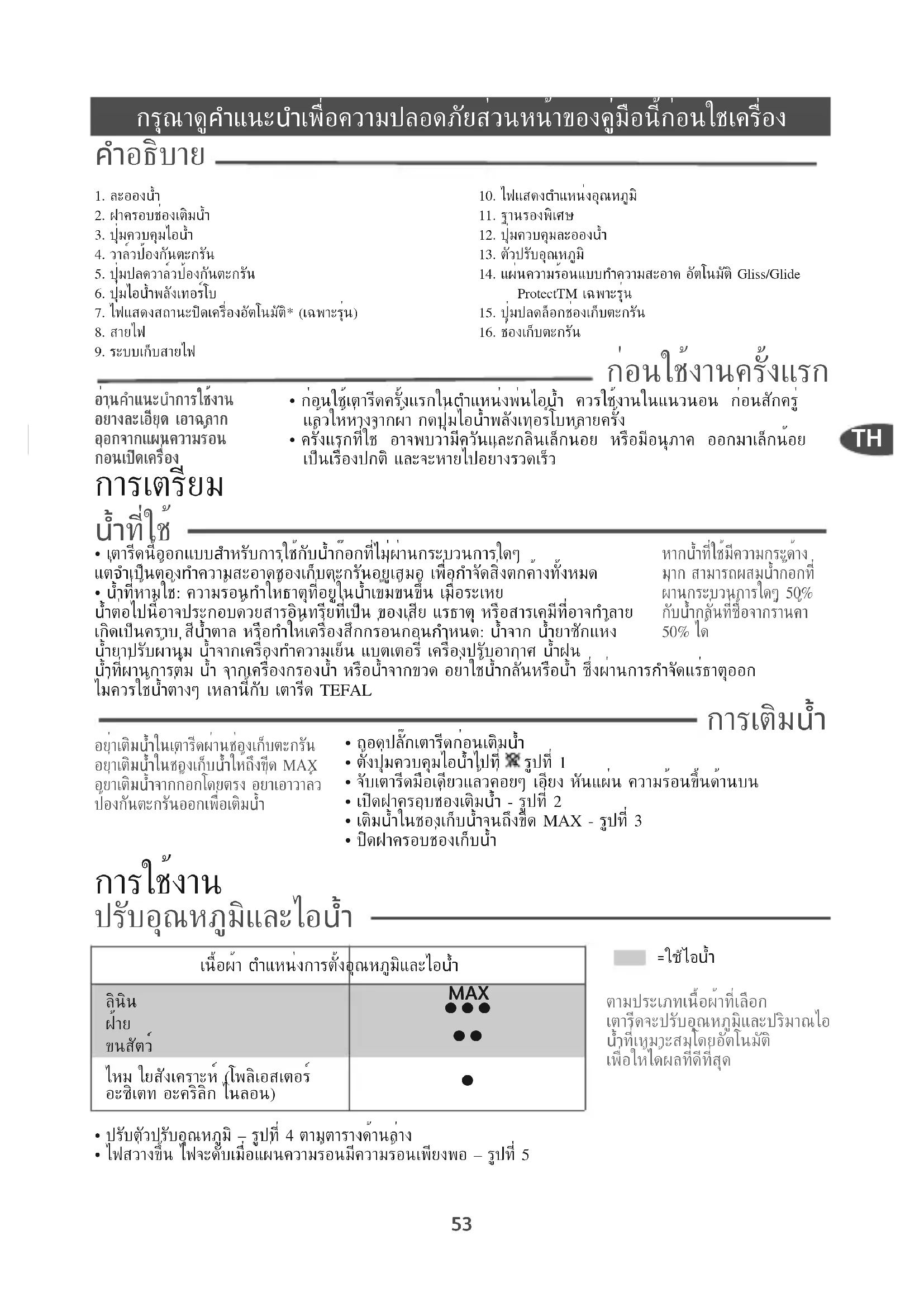 - ปรับตัวปรับอุณหภูมิ – รูปที่ 4 ตามตารางด้านล่าง• ไฟสว่างขึ้น ไฟจะดับเมื่อแผ่นความร้อนมีความร้อนเพียงพอ – รูปที่ 5อ่านคำแนะนำการใช้งานอย่างละเอียด เอาฉลากออกจากแผ่นความร้อนก่อนเปิดเครื่องอย่าเติมน้ำในเตารีดผ่านช่องเก็บตะกรันอย่าเติมน้ำในช่องเก็บน้ำให้ถึงขีด MAXอย่าเติมน้ำจากก๊อกโดยตรง อย่าเอาวาล์วป้องกันตะกรันออกเพื่อเติมน้ำหากน้ำที่ใช้มีความกระด้างมาก สามารถผสมน้ำก๊อกที่ผ่านกระบวนการใดๆ 50%กับน้ำกลั่นที่ซื้อจากร้านค้า50% ได้=ใช้ไอน้ำเนื้อผ้า ตำแหน่งการตั้งอุณหภูมิและไอน้ำลินิน ขนสัตว์์ไหม ใยสังเคราะห์ (โพลิเอสเตอร์อะซิเตท อะคริลิก ไนลอน) MAX