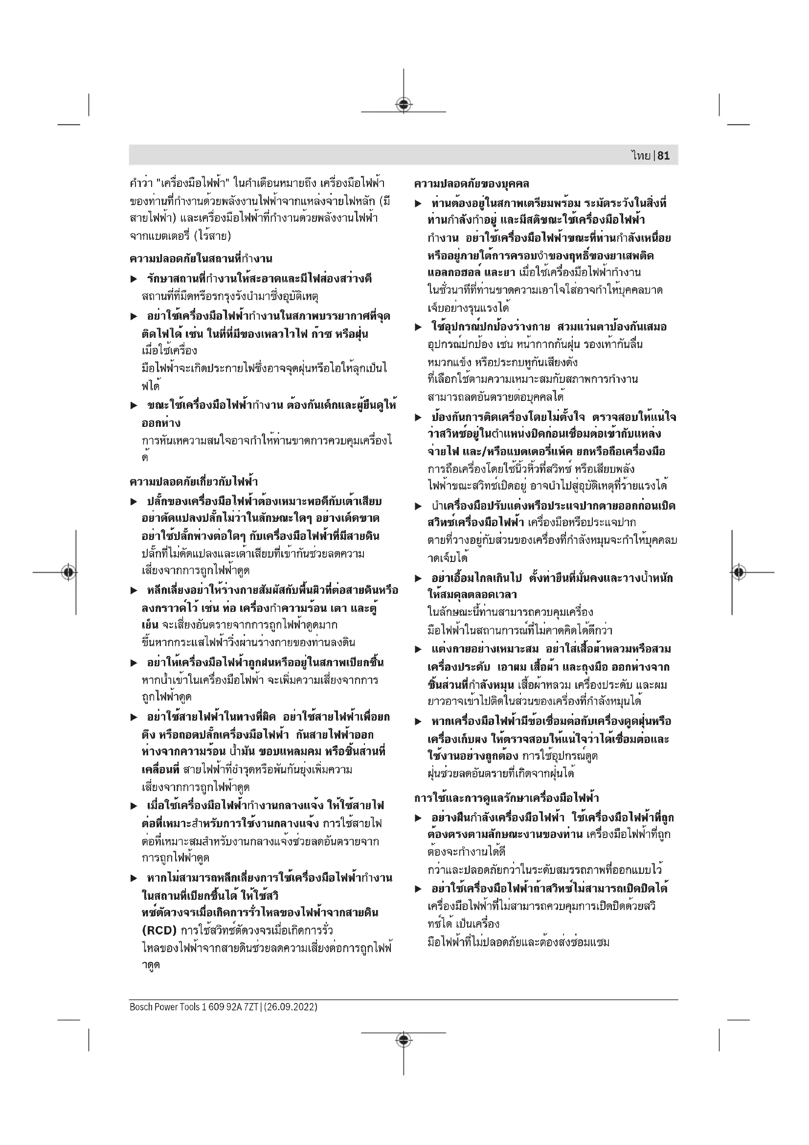 1 609 92A 7ZT | (26.09.2022) Bosch Power Toolsไทย | 81 คำว่า "เครื่องมือไฟฟ้า" ในคำเตือนหมายถึง เครื่องมือไฟฟ้า ของท่านที่ทำงานด้วยพลังงานไฟฟ้าจากแหล่งจ่ายไฟหลัก (มี สายไฟฟ้า) และเครื่องมือไฟฟ้าที่ทำงานด้วยพลังงานไฟฟ้า จากแบตเตอรี่ (ไร้สาย) ความปลอดภัยในสถานที่ทำงาน u รักษาสถานที่ทำงานให้สะอาดและมีไฟส่องสว่างดี สถานที่ที่มืดหรือรกรุงรังนำมาซึ่งอุบัติเหตุ u อย่าใช้เครื่องมือไฟฟ้าทำงานในสภาพบรรยากาศที่จุด ติดไฟได้ เช่น ในที่ที่มีของเหลวไวไฟ ก๊าซ หรือฝุ่น เมื่อใช้เครื่อง มือไฟฟ้าจะเกิดประกายไฟซึ่งอาจจุดฝุ่นหรือไอให้ลุกเป็นไ