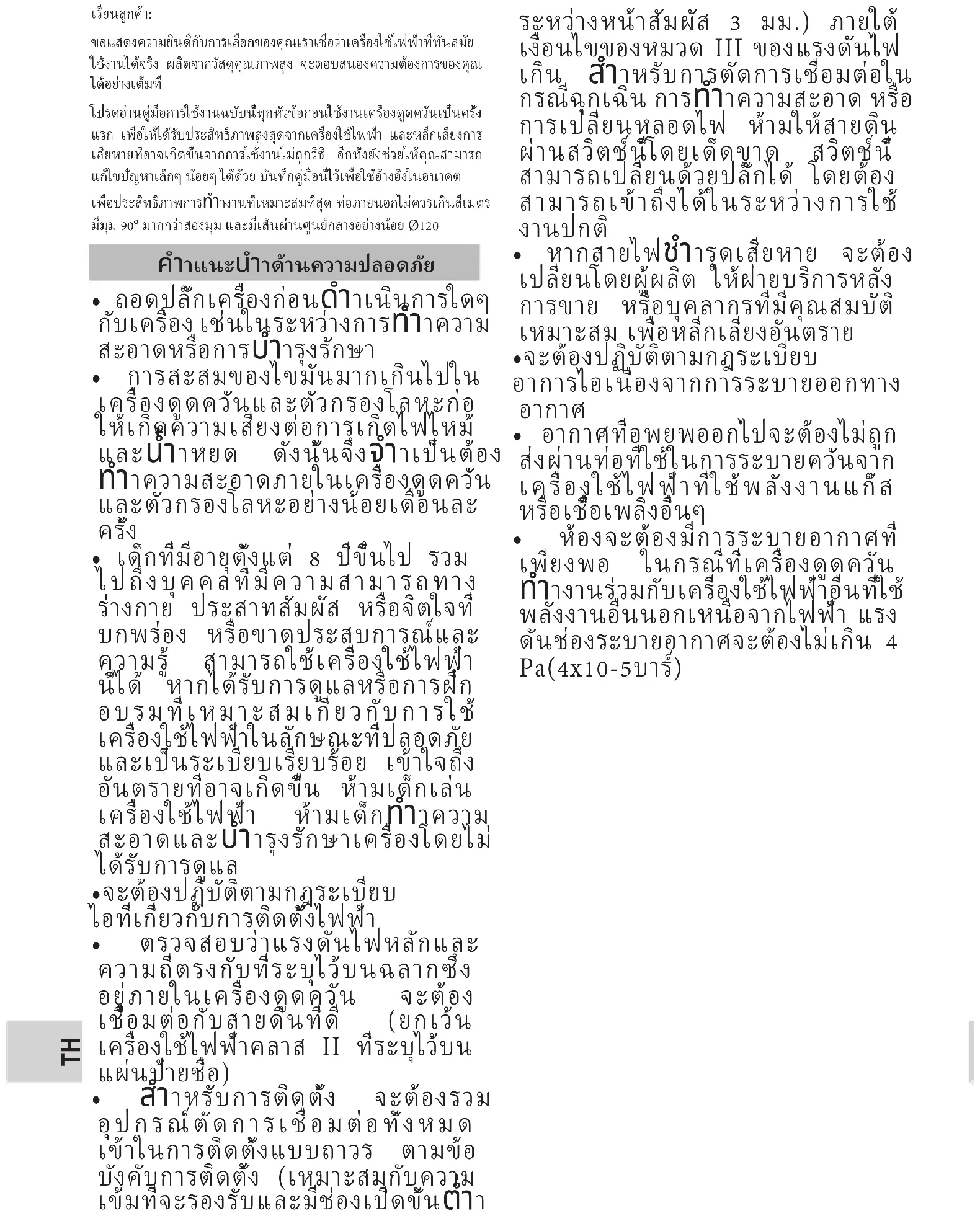 - ห้องจะต้องมีการระบายอากาศที่ เพียงพอ ในกรณีที่เครื่องดูดควัน ทำางานร่วมกับเครื่องใช้ไฟฟ้าอื่นที่ใช้ พลังงานอื่นนอกเหนือจากไฟฟ้า แรง ดันช่องระบายอากาศจะต้องไม่เกิน 4 Pa (4x10-5 บาร์) คำแนะนำด้นควมปลอดภัยTH