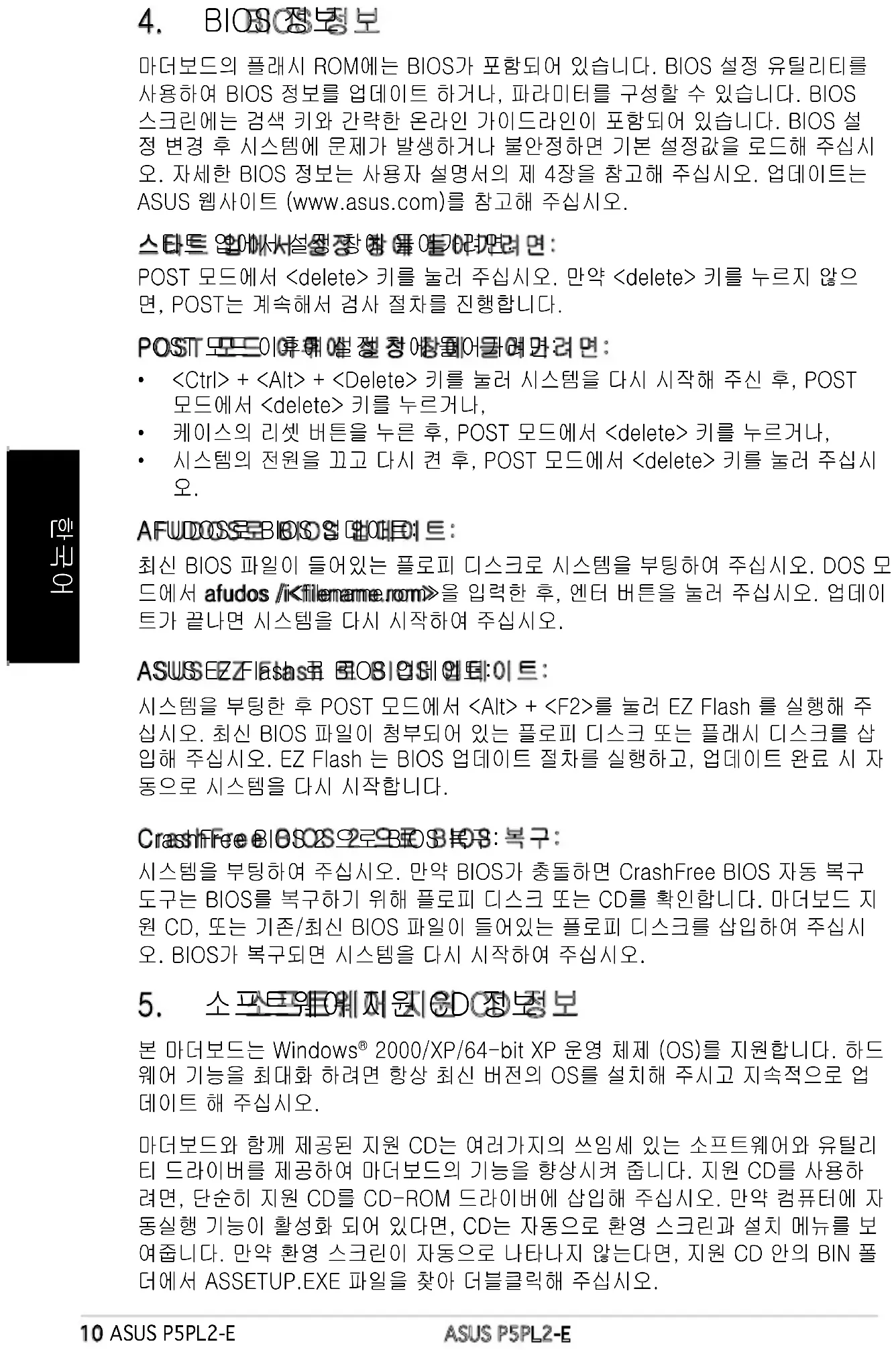 - ปิดระบบ และเปิดขึ้นมาใหม่, จากนั้นกด <Delete> ระหว่างกระบวนการ POST ในการอัปเดต BIOS ด้วย AFUDOS: บูตระบบจากฟล็อปปี้ดิสก์ที่บรรจุไฟล์ BIOS ล่าสุด ที่ DOS พร็อมต์, พิมพ์ afudos /i<lename.rom> และกด Enter บูตระบบใหม่เมื่อการอัปเดตสมบูรณ์ ในการอัปเดต BIOS ด้วย ASUS EZ Flash: บูตระบบ และกด <Alt> + <F2> ระหว่างกระบวนการ POST เพื่อเปิด EZ Flash ใส่ฟล็อปปี้ดิสก์ หรือแฟลชดิสก์ที่บรรจุไฟล์ BIOS ล่าสุด EZ Flash จะดำเนินกระบวน การอัปเดต BIOS และจะบูตระบบใหม่ โดยอัตโนมัติเมื่อทำเสร็จ ในการกู้คืน BIOS ด้วย CrashFree BIOS 2: บูตระบบ ถ้า BIOS เสีย, เครื่องมือการกู้คืน BIOS อัตโนมัติ CrashFree จะตรวจสอบฟลอปปี้ดิสก์