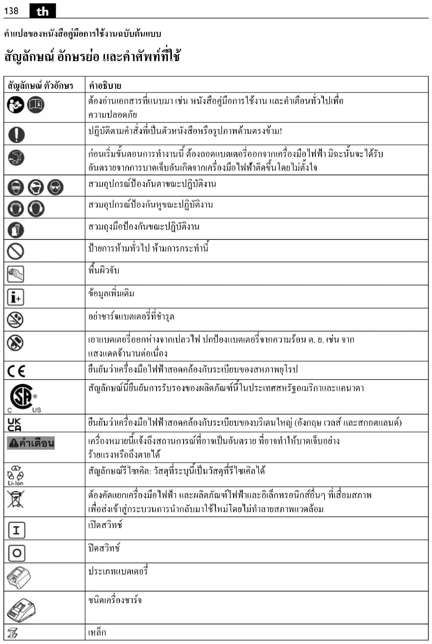 คําแปลของหนังสือคูมือการใชงานฉบับตนแบบ สัญลักษณ อักษรยอ และคําศัพทที่ใช สัญลักษณ ตัวอักษร คําอธิบาย ตองอานเอกสารที่แนบมา เชน หนังสือคูมือการใชงาน และคําเตือนทั่วไปเพื่อ ความปลอดภัย ปฏิบัติตามคําสั่งที่เปนตัวหนังสือหรือรูปภาพดานตรงขาม! กอนเริ่มขั้นตอนการทํางานนี้ ตองถอดแบตเตอรี่ออกจากเครื่องมือไฟฟา มิฉะนั้นจะไดรับ อันตรายจากการบาดเจ็บอันเกิดจากเครื่องมือไฟฟ าติดขึ้นโดยไมตั้งใจ