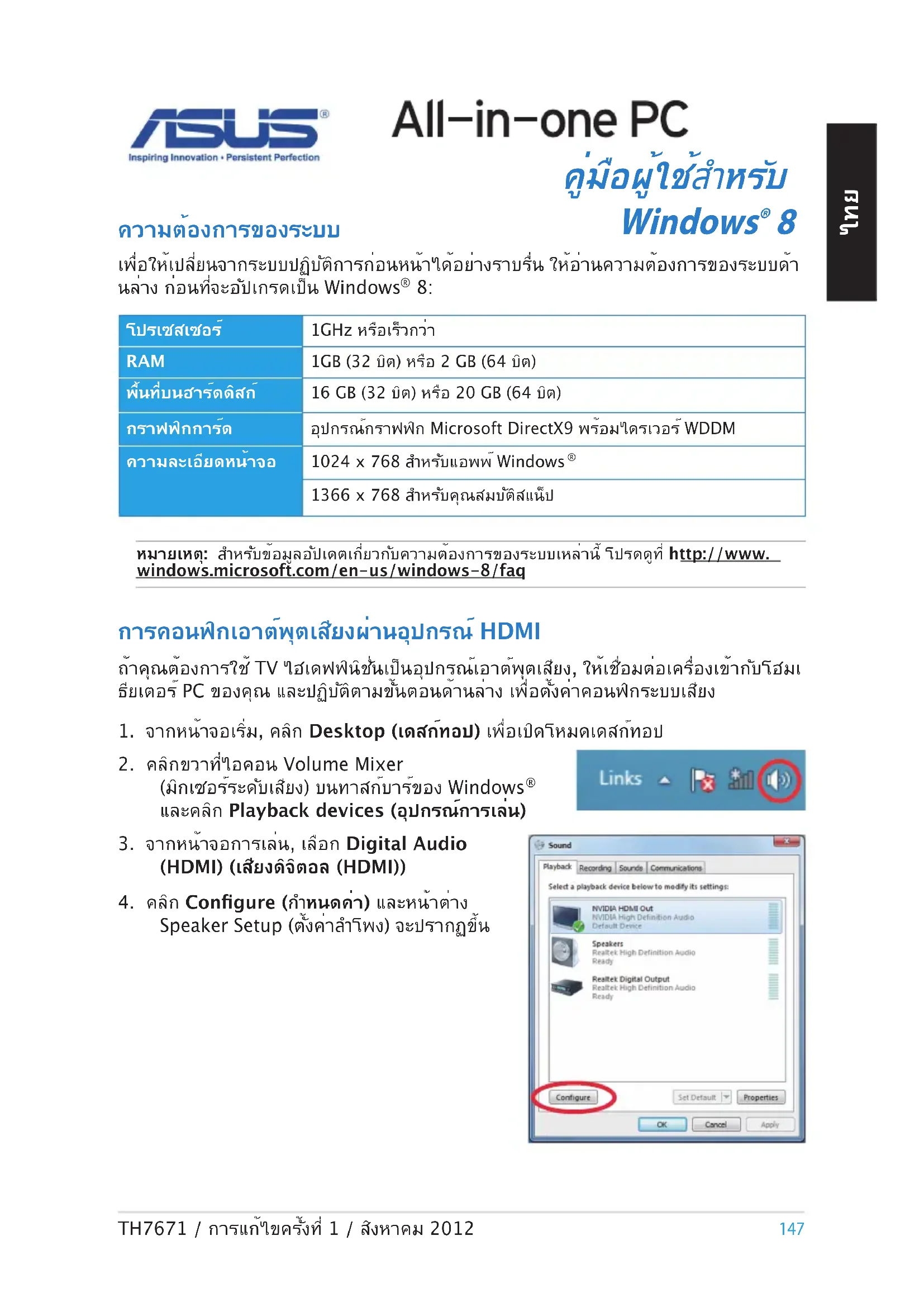 Speaker Setup (ตั้งค่าลำโพง) จะปรากฏขึ้น หมายเหตุ: สำหรับข้อมูลอัปเดตเกี่ยวกับความต้องการของระบบเหล่านี้ โปรดดูที่ http://www.windows.microsoft.com/en-us/windows-8/faq โปรเซสเซอร์1GHz หรือเร็วกว่า RAM 1GB (32 บิต) หรือ 2 GB (64 บิต)พื้นที่บนฮาร์ดดิสก์16 GB (32 บิต) หรือ 20 GB (64 บิต)กราฟฟิกการ์ดอุปกรณ์กราฟฟิก Microsoft DirectX9 พร้อมไดรเวอร์ WDDMความละเอียดหน้าจอ1024 x 768 สำหรับแอพพ์ Windows 1366 x 768 สำหรับคุณสมบัติสแน็ป ความต้องการของระบบ เพื่อให้เปลี่ยนจากระบบปฏิบัติการก่อนหน้าได้อย่างราบรื่น ให้อ่านความต้องการของระบบด้า นล่าง ก่อนที่จะอัปเกรดเป็น Windows