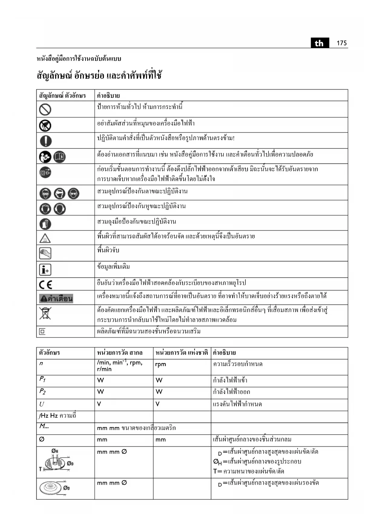 หนังสือคูมือการใชงานฉบับตนแบบ สัญลักษณ อักษรยอ และคําศัพทที่ใช สัญลักษณ ตัวอักษร คําอธิบาย ปายการหามทั่วไป หามการกระทํานี้ อยาสัมผัสสวนที่หมุนของเครื่องมือไฟฟา ปฏิบัติตามคําสั่งที่เปนตัวหนังสือหรือรูปภาพดานตรงขาม! ตองอานเอกสารที่แนบมา เชน หนังสือคูมือการใชงาน และคําเตือนทั่วไปเพื่อความปลอดภัย กอนเริ่มขั้นตอนการทํางานนี้ ตองดึงปลั๊กไฟฟาออกจากเตาเสียบ ม ิฉะนั้นจะไดรับอันตรายจาก การบาดเจ็บหากเครื่องมือไฟฟาติดขึ้นโดยไมตั งใจ สวมอุปกรณปองกันตาขณะปฏิบัติงาน สวมอุปกรณปองกันหูขณะปฏิบัติงาน สวมถุงมือปองกันขณะปฏิบัติงาน พื้นผิวที่สามารถสัมผัสไดอาจรอนจัด และดวยเหตุนี้จึงเปนอันตราย