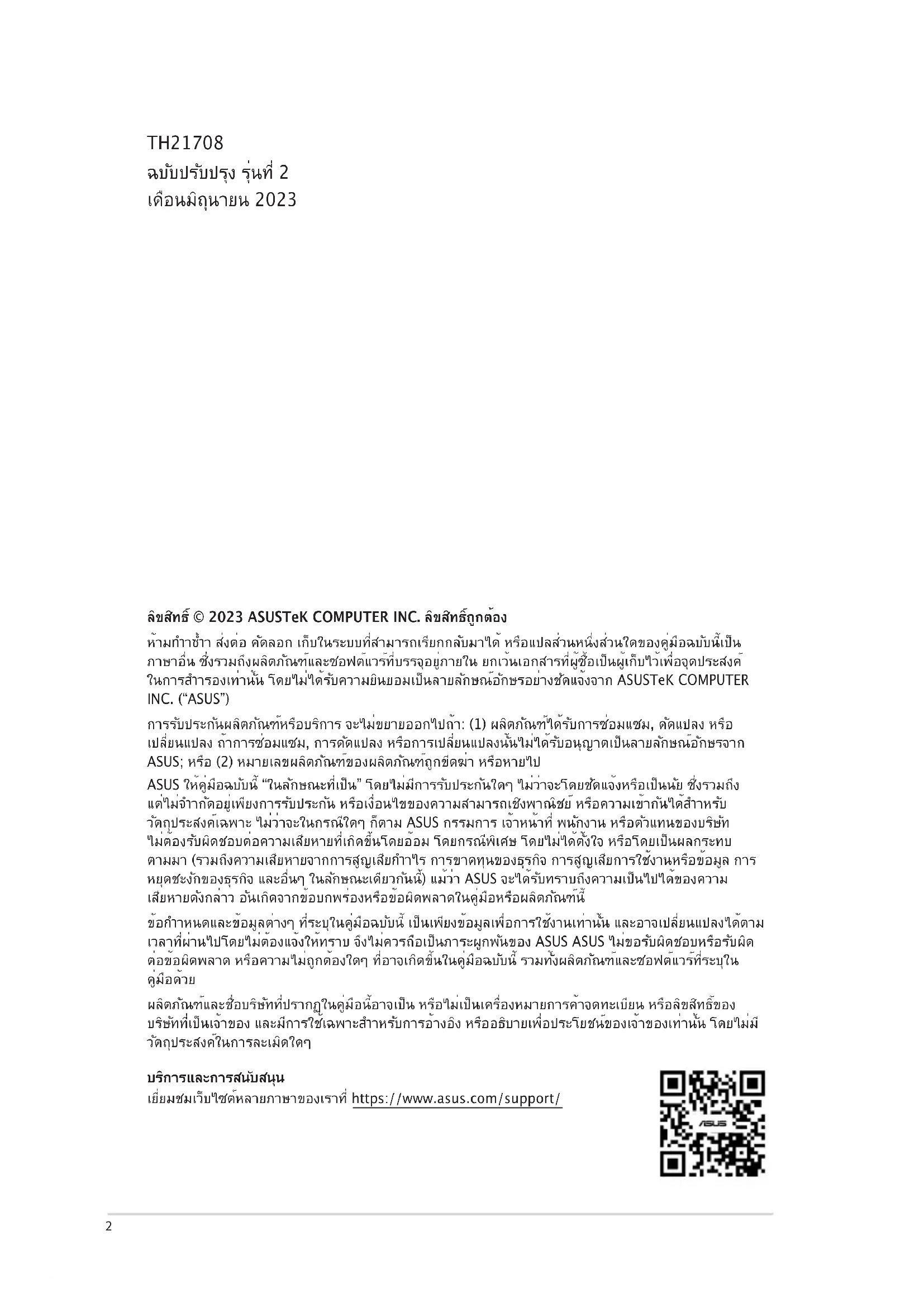 ผลิตภัณฑ์และชื่อบริษัทที่ปรากฏในคู่มือนี้อาจเป็น หรือไม่เป็นเครื่องหมายการค้าจดทะเบียน หรือลิขสิทธิ์ของ บริษัทที่เป็นเจ้าของ และมีการใช้เฉพาะสำาหรับการอ้างอิง หรืออธิบายเพื่อประโยชน์ของเจ้าของเท่านั้น โดยไม่มี วัตถุประสงค์ในการละเมิดใดๆ TH21708 ฉบับปรับปรุง รุ่นที่ 2 เดือนมิถุนายน 2023 บริการและการสนับสนุน เยี่ยมชมเว็บไซต์หลายภาษาของเราที่ https://www.asus.com/support/3