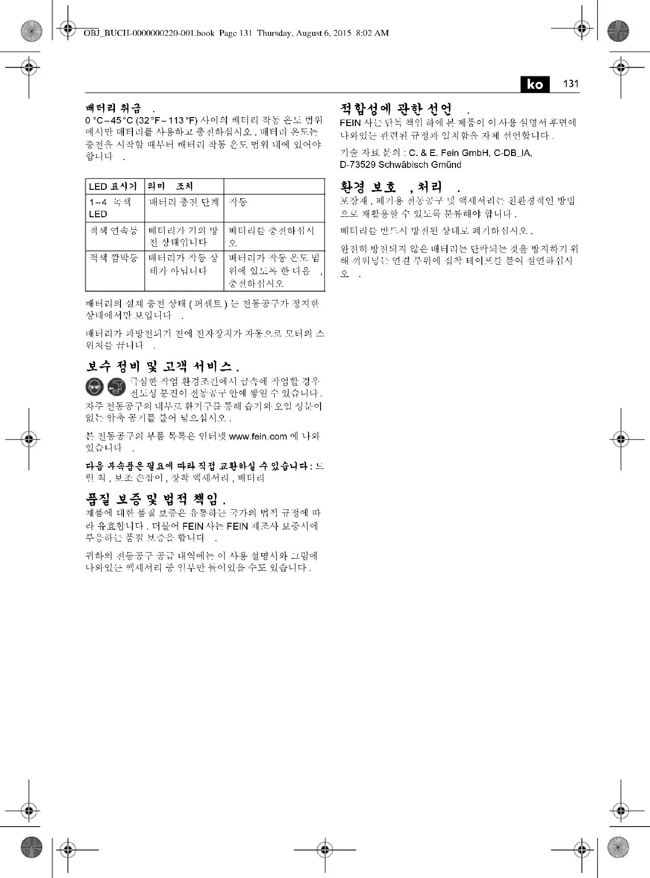 การรับรองการปฏิบัติตามมาตรฐาน บริษัท FEIN ขอรับรองโดยรับผิดชอบแตเพียงผูเดียววา ผลิตภัณฑนี้สอดคลองกับขอกําหนดที่เกี่ยวเนื องกันที่ระบุ ไวในหนาสุดทายของหนังสือคูมือการใชงานนี เอกสารทางเทคนิคที่: C. & E. Fein GmbH, C-DB_IA, D-73529 Schwäbisch Gmünd การรักษาสภาพแวดลอมและการกําจัดขยะ ตองคัดแยกหีบหอ เครื่องมือไฟฟา และอุปกรณประกอบที่ เสื่อมสภาพ เพื่อสงเขาสูกระบวนการนํากลับมาใชใหมโดยไม ทําลายสภาพแวดลอม ตองคายประจุออกกอนนําแบตเตอรี่ไปทิ้งอยางถูกตอง สําหรับแบตเตอรี่ที่คายประจุออกไมหมดสิ้น ใหห อหุมขั้วดวย ฉนวนเทปเพื่อปองกันการลัดวงจร