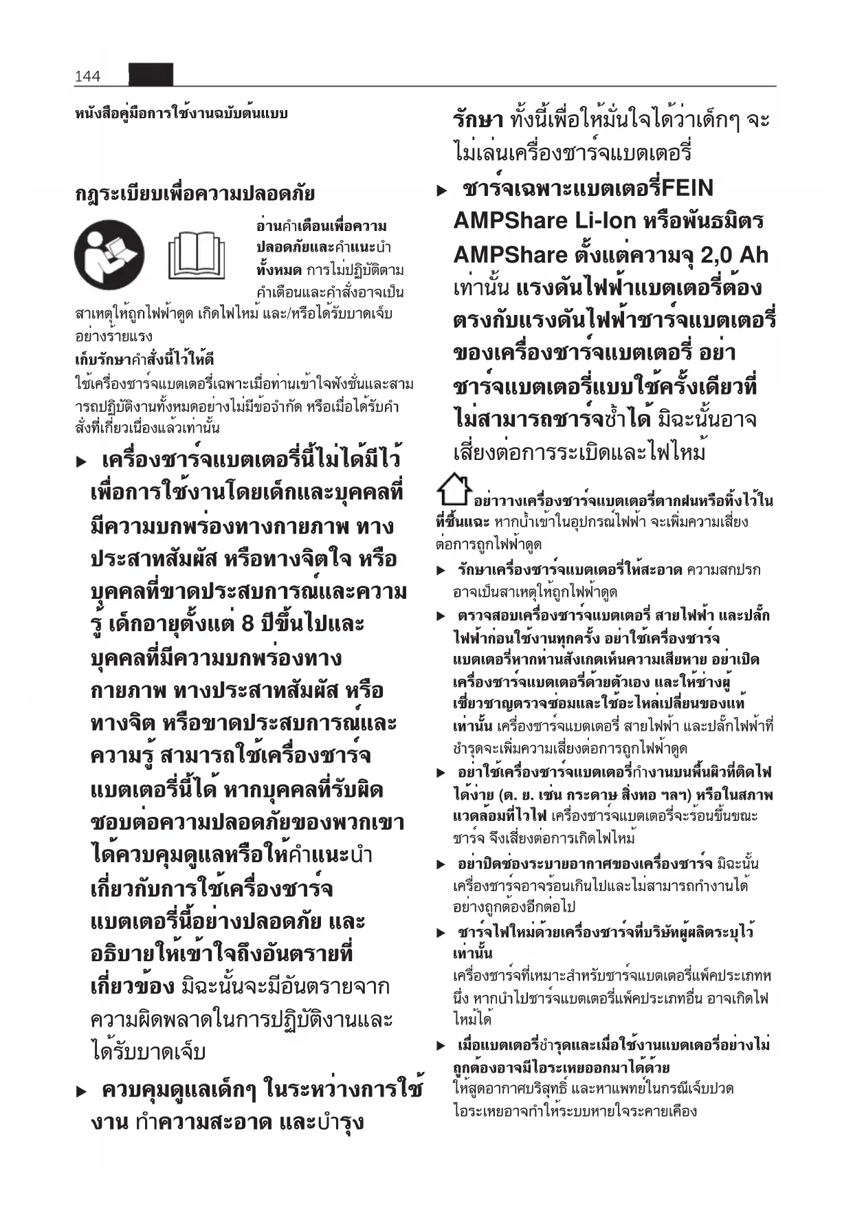 ko 143 34101366060 • 1.6.22หนังสือคู่มือการใช้งานฉบับต้นแบบ กฎระเบียบเพื่อความปลอดภัยไทย อ่านคำเตือนเพื่อความ ปลอดภัยและคำแนะนำ ทั้งหมด การไม่ปฏิบัติตาม คำเตือนและคำสั่งอาจเป็น สาเหตุให้ถูกไฟฟ้าดูด เกิดไฟไหม้ และ/หรือได้รับบาดเจ็บ อย่างร้ายแรง เก็บรักษาคำสั่งนี้ไว้ให้ดี ใช้เครื่องชาร์จแบตเตอรี่เฉพาะเมื่อท่านเข้าใจฟังชั่นและสาม ารถปฏิบัติงานทั้งหมดอย่างไม่มีข้อจำกัด หรือเมื่อได้รับคำ สั่งที่เกี่ยวเนื่องแล้วเท่านั้น u เครื่องชาร์จแบตเตอรี่นี้ไม่ได้มีไว้ เพื่อการใช้งานโดยเด็กและบุคคลที่ มีความบกพร่องทางกายภาพ ทาง ประสาทสัมผัส หรือทางจิตใจ หรือ บุคคลที่ขาดประสบการณ์และความ รู้ เด็กอายุตั้งแต่ 8 ปีขึ้นไปและ บุคคลที่มีความบกพร่องทาง กายภาพ ทางประสาทสัมผัส หรือ ทางจิต หรือขาดประสบการณ์และ ความรู้ สามารถใช้เครื่องชาร์จ แบตเตอรี่นี้ได้ หากบุคคลที่รับผิด ชอบต่อความปลอดภัยของพวกเขา ได้ควบคุมดูแลหรือให้คำแนะนำ เกี่ยวกับการใช้เครื่องชาร์จ แบตเตอรี่นี้อย่างปลอดภัย และ อธิบายให้เข้าใจถึงอันตรายที่ เกี่ยวข้อง มิฉะนั้นจะมีอันตรายจาก ความผิดพลาดในการปฏิบัติงานและ ได้รับบาดเจ็บ u ควบคุมดูแลเด็กๆ ในระหว่างการใช้ งาน ทำความสะอาด และบำรุง รักษา ทั้งนี้เพื่อให้มั่นใจได้ว่าเด็กๆ จะ ไม่เล่นเครื่องชาร์จแบตเตอรี่ u ชาร์จเฉพาะแบตเตอรี่FEIN AMPShare Li-Ion หรือพันธมิตร AMPShare ตั้งแต่ความจุ 2,0Ah เท่านั้น แรงดันไฟฟ้าแบตเตอรี่ต้อง ตรงกับแรงดันไฟฟ้าชาร์จแบตเตอรี่ ของเครื่องชาร์จแบตเตอรี่ อย่า ชาร์จแบตเตอรี่แบบใช้ครั้งเดียวที่ ไม่สามารถชาร์จซ้ำได้ มิฉะนั้นอาจ เสี่ยงต่อการระเบิดและไฟไหม้ อย่าวางเครื่องชาร์จแบตเตอรี่ตากฝนหรือทิ้งไว้ใน ที่ชื้นแฉะ หากน้ำเข้าในอุปกรณ์ไฟฟ้า จะเพิ่มความเสี่ยง ต่อการถูกไฟฟ้าดูด u รักษาเครื่องชาร์จแบตเตอรี่ให้สะอาด ความสกปรก อาจเป็นสาเหตุให้ถูกไฟฟ้าดูด u ตรวจสอบเครื่องชาร์จแบตเตอรี่ สายไฟฟ้า และปลั๊ก ไฟฟ้าก่อนใช้งานทุกครั้ง อย่าใช้เครื่องชาร์จ แบตเตอรี่หากท่านสังเกตเห็นความเสียหาย อย่าเปิด เครื่องชาร์จแบตเตอรี่ด้วยตัวเอง และให้ช่างผู้ เชี่ยวชาญตรวจซ่อมและใช้อะไหล่เปลี่ยนของแท้ เท่านั้น เครื่องชาร์จแบตเตอรี่ สายไฟฟ้า และปลั๊กไฟฟ้าที่ ชำรุดจะเพิ่มความเสี่ยงต่อการถูกไฟฟ้าดูด u อย่าใช้เครื่องชาร์จแบตเตอรี่ทำงานบนพื้นผิวที่ติดไฟ ได้ง่าย (ต. ย. เช่น กระดาษ สิ่งทอ ฯลฯ) หรือในสภาพ แวดล้อมที่ไวไฟ เครื่องชาร์จแบตเตอรี่จะร้อนขึ้นขณะ ชาร์จ จึงเสี่ยงต่อการเกิดไฟไหม้ u อย่าปิดช่องระบายอากาศของเครื่องชาร์จ ม