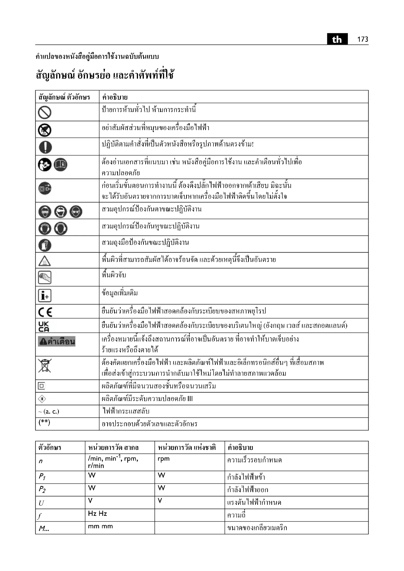 ขอมูลเพิ่มเติม ยืนยันวาเครื่องมือไฟฟาสอดคลองกับระเบียบของสหภาพยุโรป ยืนยันวาเครื่องม ือไฟฟาสอดคลองกับระเบียบของบริเตนใหญ (อังกฤษ เวลส และสกอตแลนด) เครื่องหมายนี้แจงถึงสถานการณที่อาจเปนอันตราย ที่อาจทําใหบาดเจ็บอยาง รายแรงหรือถึงตายได ตองคัดแยกเครื่องมือไฟฟา และผลิตภัณฑไฟฟาและอิเล็กทรอนิกสอื่นๆ ที่เสื่อมสภาพ เพื่อสงเขาสูกระบวนการนํากลับมาใชใหมโดยไมทําลายสภาพแวดลอม ผลิตภัณฑที่มีฉนวนสองชั้นหรือฉนวนเสริม ผลิตภัณฑมีระดับความปลอดภัย III ~(a. c.) ไฟฟากระแสสลับ