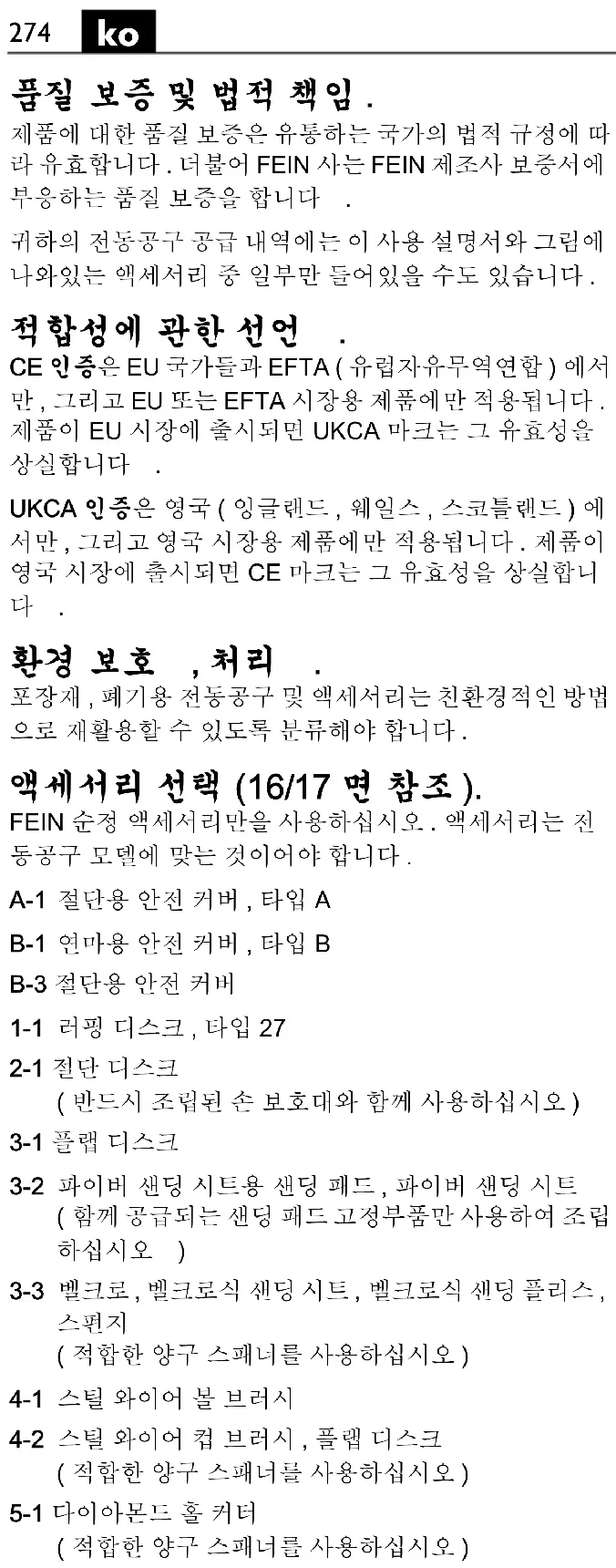 UKCA ใชไดเฉพาะกับตลาดบริเตนใหญ (อังกฤษ เวลส และสกอตแลนด) และสําหรับผลิตภัณฑที่มีไว สําหรับตลาดบริเตนใหญเทานั้น หลังจากวางจําหนาย ผลิตภัณฑในตลาดบริเตนใหญ เครื่องหมาย CE จะ ไมมีผลบังคับใช การรักษาสภาพแวดลอมและการกําจัดขยะ ตองคัดแยกหีบหอ เครื่องมือไฟฟา และอุปกรณประกอบที่ เสื่อมสภาพ เพื่อสงเขาสูกระบวนการนํากลับมาใชใหมโดยไม ทําลายสภาพแวดลอม การเลือกอุปกรณประกอบ (ดูหนา 16/17). ใชเฉพาะอุปกรณประกอบของแทของ FEIN เทานั้น อุปกรณ ประกอบตองผลิตมาสําหรับประเภทเครื่องมือไฟฟานั้น A-1 ฝาครอบปองกันสําหรับการตัด type A B-1 ฝาครอบปองกันสําหรับการเจียร type B B-3 ฝาครอบนิรภัยสําหรับการตัด 1-1 แผนเจียร type 27 2-1 แผนตัด (ใชเฉพาะกับฝาครอบนิรภัยที่ติดตั้งเทานั้น) 3-1 แผนขัดทรายซอน 3-2 แผนรองสําหรับแผนขัดไฟเบอร แผนขัดไฟเบอร (ติดตั้งเฉพาะกับชุดยึดแผนรองที่ใหมาเทานั้น) 3-3 แผนรองที่มี Velco แผนขัด Velco ผาฟลีซขัดพรอม ตัวยึดที่มี Velco ฟองน้ํา (ใชประแจปากตายที่เหมาะสม) 4-1 แปรงลวดเหล็กทรงกรวย 4-2 แปรงลวดเหล็กรูปถวย แผนขัดทรายซอน (ใชประแจปากตายที่เหมาะสม) 5-1 คัตเตอรเจาะรูหัวเพชร (ใชประแจปากตายที่เหมาะสม)285