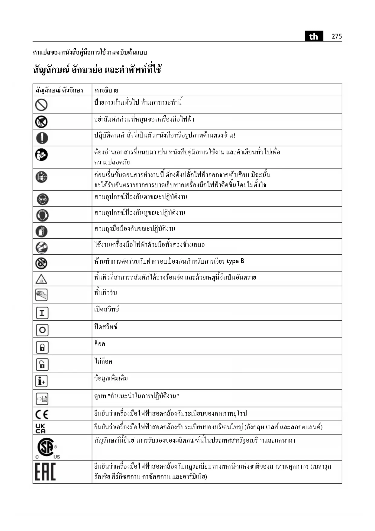 ขอมูลเพิ่มเติม ดูบท "คําแนะนําในการปฏิบัติงาน" ยืนยันวาเครื่องมือไฟฟาสอดคลองกับระเบียบของสหภาพยุโรป ยืนยันวาเครื่องมือไฟฟาสอดคลองกับระเบียบของบริเตนใหญ (อังกฤษ เวลส และสกอตแลนด) สัญลักษณนี้ยืนยั นการรับรองของผลิตภัณฑนี้ในประเทศสหรัฐอเมริกาและแคนาดา ยืนยันวาเครื่องมือไฟฟาสอดคลองกับกฎระเบียบทางเทคนิคแหงชาติของสหภาพศุลกากร (เบลารุส รัสเซีย คีรกีซสถาน คาซัคสถาน และอารมีเนีย)276