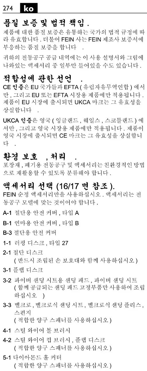 UKCA ใชไดเฉพาะกับตลาดบริเตนใหญ (อังกฤษ เวลส และสกอตแลนด) และสําหรับผลิตภัณฑที่มีไว สําหรับตลาดบริเตนใหญเทานั้น หลังจากวางจําหนาย ผลิตภัณฑในตลาดบริเตนใหญ เครื่องหมาย CE จะ ไมมีผลบังคับใช การรักษาสภาพแวดลอมและการกําจัดขยะ ตองคัดแยกหีบหอ เครื่องมือไฟฟา และอุปกรณประกอบที่ เสื่อมสภาพ เพื่อสงเขาสูกระบวนการนํากลับมาใชใหมโดยไม ทําลายสภาพแวดลอม การเลือกอุปกรณประกอบ (ดูหนา 16/17). ใชเฉพาะอุปกรณประกอบของแทของ FEIN เทานั้น อุปกรณ ประกอบตองผลิตมาสําหรับประเภทเครื่องมือไฟฟานั้น A-1 ฝาครอบปองกันสําหรับการตัด type A B-1 ฝาครอบปองกันสําหรับการเจียร type B B-3 ฝาครอบนิรภัยสําหรับการตัด 1-1 แผนเจียร type 27 2-1 แผนตัด (ใชเฉพาะกับฝาครอบนิรภัยที่ติดตั้งเทานั้น) 3-1 แผนขัดทรายซอน 3-2 แผนรองสําหรับแผนขัดไฟเบอร แผนขัดไฟเบอร (ติดตั้งเฉพาะกับชุดยึดแผนรองที่ใหมาเทานั้น) 3-3 แผนรองที่มี Velco แผนขัด Velco ผาฟลีซขัดพรอม ตัวยึดที่มี Velco ฟองน้ํา (ใชประแจปากตายที่เหมาะสม) 4-1 แปรงลวดเหล็กทรงกรวย 4-2 แปรงลวดเหล็กรูปถวย แผนขัดทรายซอน (ใชประแจปากตายที่เหมาะสม) 5-1 คัตเตอรเจาะรูหัวเพชร (ใชประแจปากตายที่เหมาะสม)285