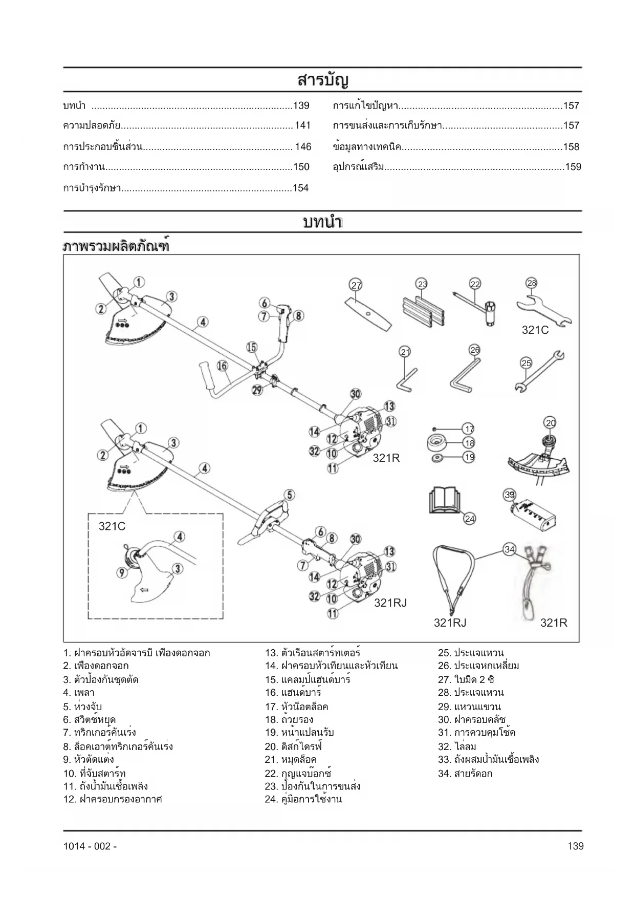 1531014 - 002 - สัญลักษณ์บนผลิตภัณฑ์ คำเตือน! ผลิตภัณฑ์นี้มีอันตราย ผู้ปฏิบัติงานหรือ ผู้ที่ยืนดูอยู่อาจได้รับบาดเจ็บหรือเสียชีวิตได้ หาก ไม่ได้ใช้ผลิตภัณฑ์อย่างระมัดระวังและถูกต้อง เพื่อป้องกันการบาดเจ็บของผู้ปฏิบัติงานหรือผู้ยืน ดู โปรดอ่านและปฏิบัติตามคำแนะนำด้านความ ปลอดภัยทั้งหมดในคู่มือการใช้งาน โปรดอ่านคู่มือการใช้งานอย่างละเอียดและให้ แน่ใจว่าคุณเข้าใจคำแนะนำก่อนใช้งาน ผลิตภัณฑ์นี้สอดคล้องกับคำสั่ง EC ที่บังคับใช้ ใช้หมวกนิรภัยในสถานที่ที่อาจมีวัสดุตกใส่คุณ ได้ ใช้อุปกรณ์ป้องกันเสียงที่ผ่านการรับรอง ใช้ อุปกรณ์ป้องกันดวงตาที่ผ่านการรับรอง ใช้ถุงมือป้องกันที่ผ่านการรับรอง ใช้รองเท้าบูทกันลื่นสำหรับงานหนัก ผลิตภัณฑ์อาจทำให้วัตถุกระเด็นออกมา ซึ่งอาจ ทำให้เกิดการบาดเจ็บได้ (321R 321RJ) รักษาระยะห่างจากบุคคลหรือสัตว์อย่างน้อย 15 เมตร (50 ฟุต) ระหว่างการใช้งานผลิตภัณฑ์ ผลิตภัณฑ์อาจทำให้วัตถุกระเด็นออกมา ซึ่งอาจ ทำให้เกิดการบาดเจ็บได้ (321C) ความเร็วสูงสุดของเพลาส่งกำลัง 50 ฟุต