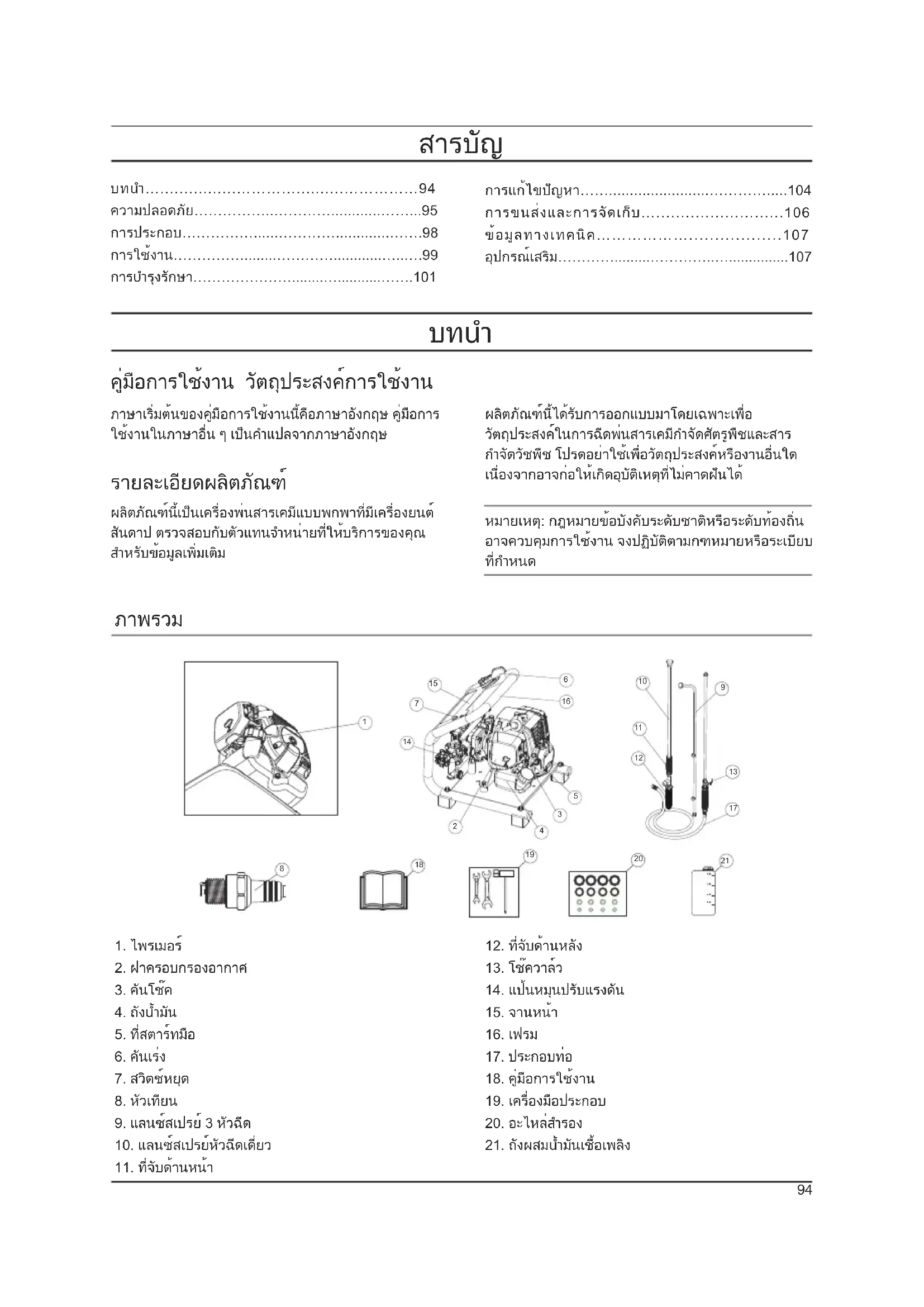 บทนำ…................…………..........……………94 ความปลอดภัย……………..…………............……...95 การประกอบ……………......………….............…….98 การใช้งาน……………........…………............…..….99 การบำรุงรักษา…………………........…...........…….101 การแก้ไขปัญหา……........................………….....104 การขนส่งและการจัดเก็บ….................…......106 ข้อมูลทางเทคนิค………………..................107 อุปกรณ์เสริม………….........…………..…...............107