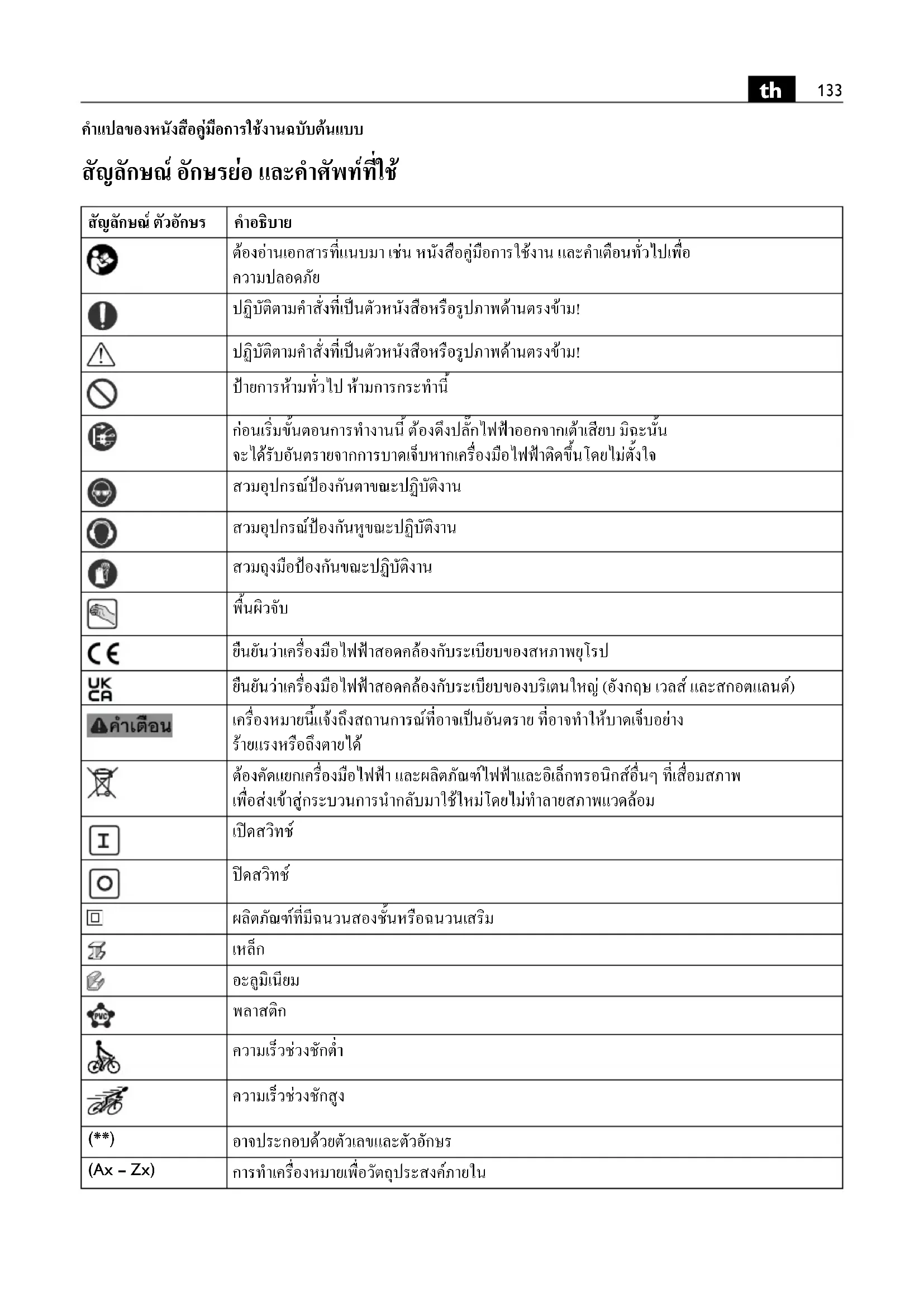 เพื่อความปลอดภัยของทาน ตองอานคําเตือนเพื่อความปลอดภัยและ คําสั่งทั้งหมด การไมปฏิบัติตามคําเตือนและ คําสั่งอาจเปนสาเหตุใหถูกไฟฟาดูด เกิดไฟไหม และ/หรือ ไดรับบาดเจ็บอยางรายแรงเก็บรักษาคําเตือนและคําสั่ง ทั้งหมดสําหรับใชอางอิงในภายหลัง อยาใชเครื่องมือไฟฟา กอนไดอานหนังสือคูมือ การใชงานนี้ รวมทั้ง "คําเตือนทั่วไปเพื่อความ ปลอดภัย"ที่แนบมา (เอกสารเลขท ี่ 3 41 30 465 06 0) อยางละเอียดและเขาใจอยางครบถวนแลว เก็บรักษา เอกสารดังกลาวสําหรับใชในภายหลัง และใหแนบไปกับ เครื่องมือไฟฟาหากนําไปแจกจายหรือขาย กรุณาปฏิบัติตามกฎระเบียบเพื่อความปลอดภัยทาง อุตสาหกรรมที่ใชในประเทศที่เกี่ยวเนื่องดวยเชนกัน ตัวอักษร หนวยการวัด สากล หนวยการวัด แหงชาติ คําอธิบาย
