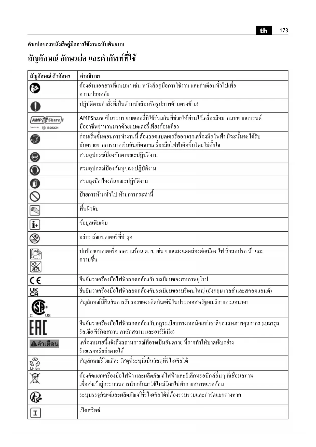 ยืนยันวาเครื่องมือไฟฟาสอดคลองกับระเบียบของสหภาพยุโรป ยืนยันวาเครื่องมือไฟฟาสอดคลองกับระเบียบของบริเตนใหญ (อั งกฤษ เวลส และสกอตแลนด) สัญลักษณนี้ยืนยันการรับรองของผลิตภัณฑนี้ในประเทศสหรัฐอเมริกาและแคนาดา ยืนยันวาเครื่องมือไฟฟาสอดคลองกับกฎระเบียบทางเทคนิคแหงชาติของสหภาพศุลกากร (เบลารุส รัสเซีย คีรกีซสถาน คาซัคสถาน และอารมีเนีย) เครื่องหมายนี้แจงถึงสถานการณที่อาจเปนอันตราย ที่อาจทําใหบาดเจ็บอยาง รายแรงหรือถึงตายได สัญลักษณรีไซเคิล: วัสดุที่ระบุนี้เปนวัสดุท ี่รีไซเคิลได ตองคัดแยกเครื่องมือไฟฟา และผลิตภัณฑไฟฟาและอิเล็กทรอนิกสอื่นๆ ที่เสื่อมสภาพ เพื่อสงเขาสูกระบวนการนํากลับมาใชใหมโดยไมทําลายสภาพแวดลอม ระบุบรรจุภัณฑและผลิตภัณฑที่รีไซเคิลไดที่ตองรวบรวมและกําจัดแยกตางหาก