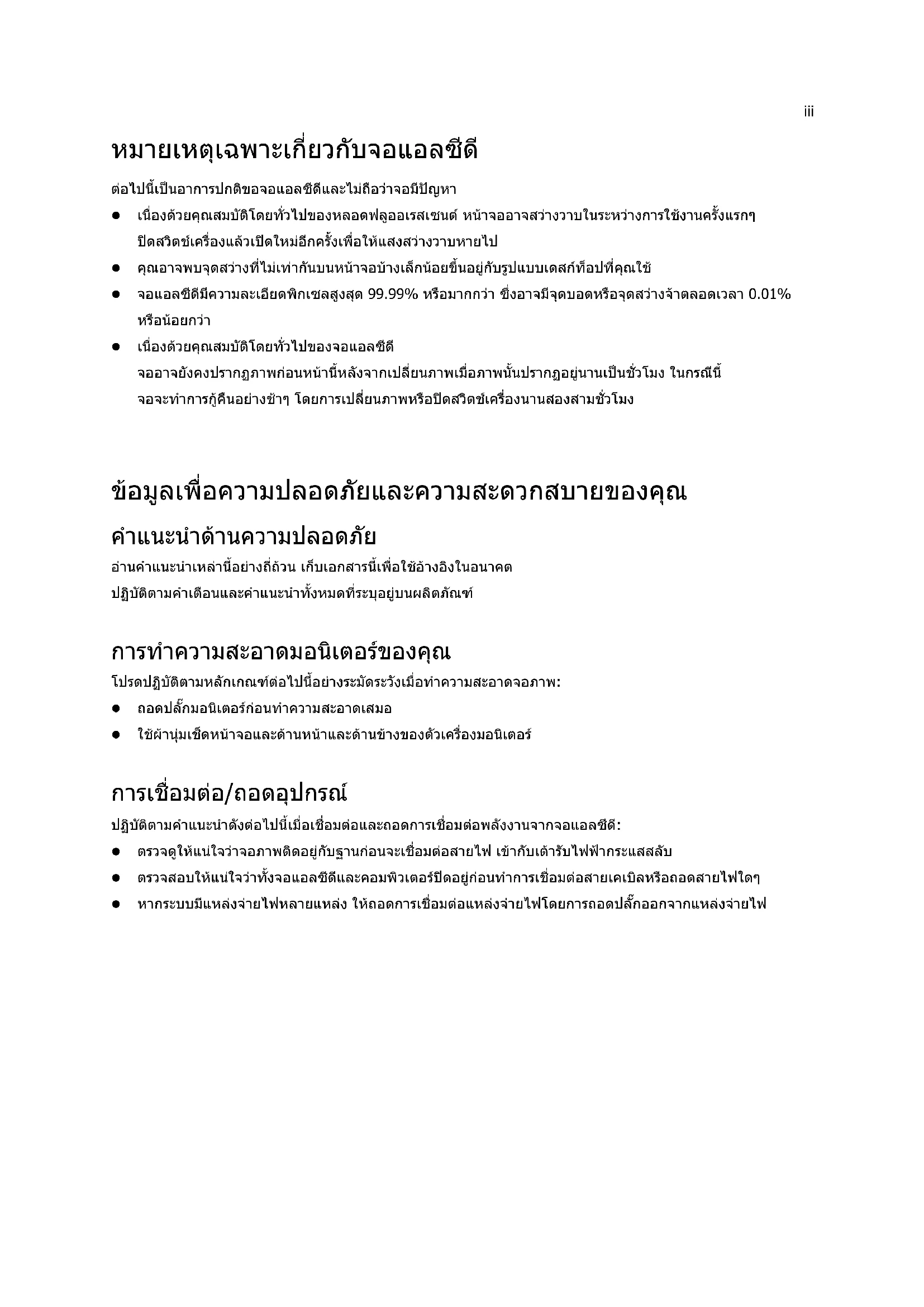 ขอมูลเพื่อความปลอดภัยและความสะดวกสบายของคุณ คําแนะนําดานความปลอดภัย อานคําแนะนําเหลานี้อยางถี่ถวน เก็บเอกสารนี้เพื่อใชอางอิงในอนาคต ปฏิบัติตามคําเตือนและคําแนะนําทั้งหมดที่ระบุอยูบนผลิตภัณฑ การทําความสะอาดมอนิเตอรของคุณ โปรดปฏิบัติตามหลักเกณฑตอไปนี้อยางระมัดระวังเมื่อทําความสะอาดจอภาพ: z ถอดปลั๊กมอนิเตอรกอนทําความสะอาดเสมอ z ใชผานุมเช็ดหนาจอและดานหนาและดานขางของตัวเครื่องมอนิเตอร การเชื่อมตอ/ถอดอุปกรณ ปฏิบัติตามคําแนะนําดังตอไปนี้เมื่อเชื่อมตอและถอดการเชื่อมตอพลังงานจากจอแอลซีดี: z ตรวจดูใหแนใจวาจอภาพติดอยูกับฐานกอนจะเชื่อมตอสายไฟ เขากับเตารับไฟฟากระแสสลับ z ตรวจสอบใหแนใจวาทั้งจอแอลซีดีและคอมพิวเตอรปดอยูกอนทําการเชื่อมตอสายเคเบิลหรือถอดสายไฟใดๆ z หากระบบมีแหลงจายไฟหลายแหลง ใหถอดการเชื่อมตอแหลงจายไฟโดยการถอดปลั๊กออกจากแหลงจายไฟiv