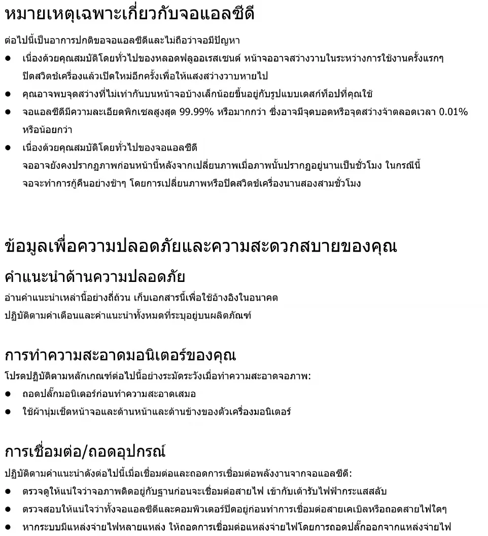 ขอมูลเพื่อความปลอดภัยและความสะดวกสบายของคุณ คําแนะนําดานความปลอดภัย อานคําแนะนําเหลานี้อยางถี่ถวน เก็บเอกสารนี้เพื่อใชอางอิงในอนาคต ปฏิบัติตามคําเตือนและคําแนะนําทั้งหมดที่ระบุอยูบนผลิตภัณฑ การทําความสะอาดมอนิเตอรของคุณ โปรดปฏิบัติตามหลักเกณฑตอไปนี้อยางระมัดระวังเมื่อทําความสะอาดจอภาพ: z ถอดปลั๊กมอนิเตอรกอนทําความสะอาดเสมอ z ใชผานุมเช็ดหนาจอและดานหนาและดานขางของตัวเครื่องมอนิเตอร การเชื่อมตอ/ถอดอุปกรณ ปฏิบัติตามคําแนะนําดังตอไปนี้เมื่อเชื่อมตอและถอดการเชื่อมตอพลังงานจากจอแอลซีดี: z ตรวจดูใหแนใจวาจอภาพติดอยูกับฐานกอนจะเชื่อมตอสายไฟ เขากับเตารับไฟฟากระแสสลับ z ตรวจสอบใหแนใจวาทั้งจอแอลซีดีและคอมพิวเตอรปดอยูกอนทําการเชื่อมตอสายเคเบิลหรือถอดสายไฟใดๆ z หากระบบมีแหลงจายไฟหลายแหลง ใหถอดการเชื่อมตอแหลงจายไฟโดยการถอดปลั๊กออกจากแหลงจายไฟiv