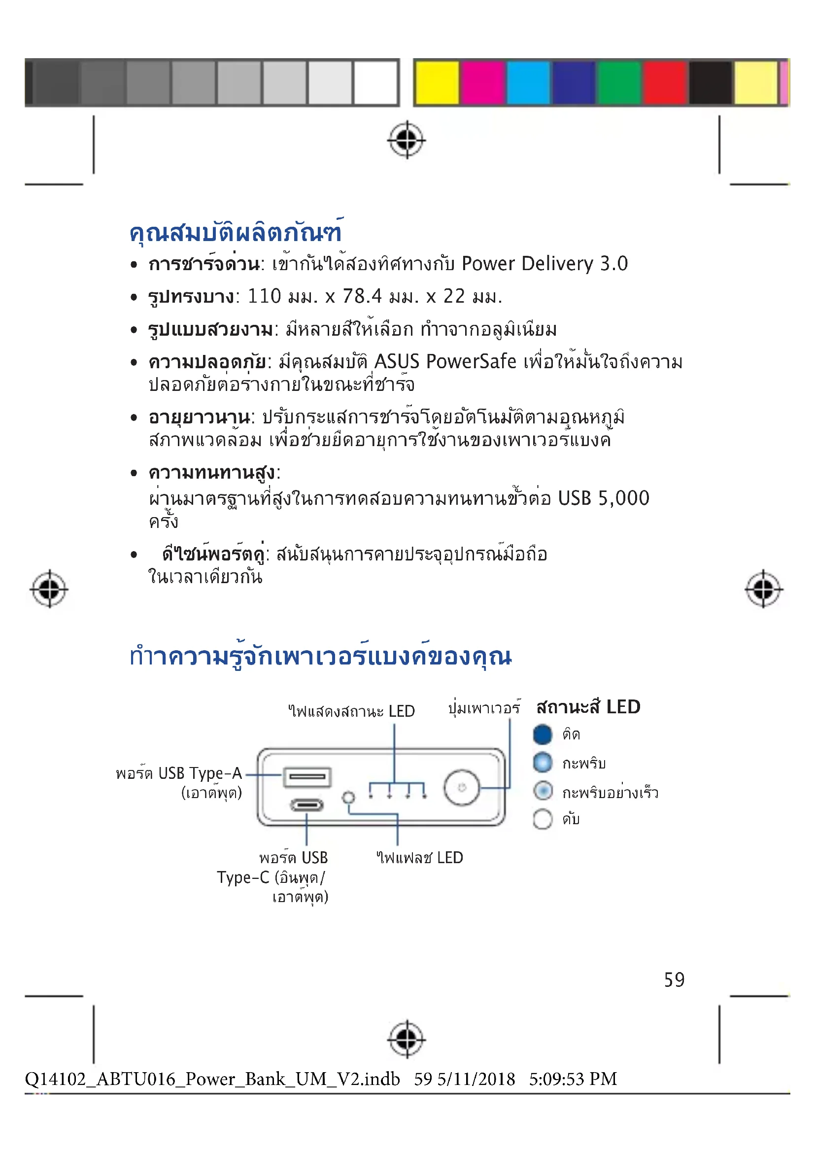 ไฟแสดงสถานะLED ปุ่มเพาเวอร์ ไฟแฟลชLED Q14102_ABTU016_Power_Bank_UM_V2.indb 59 5/11/2018 5:09:53 PM60 การชาร์จเพาเวอร์แบงค์ ไฟแสดงสถานะ LED