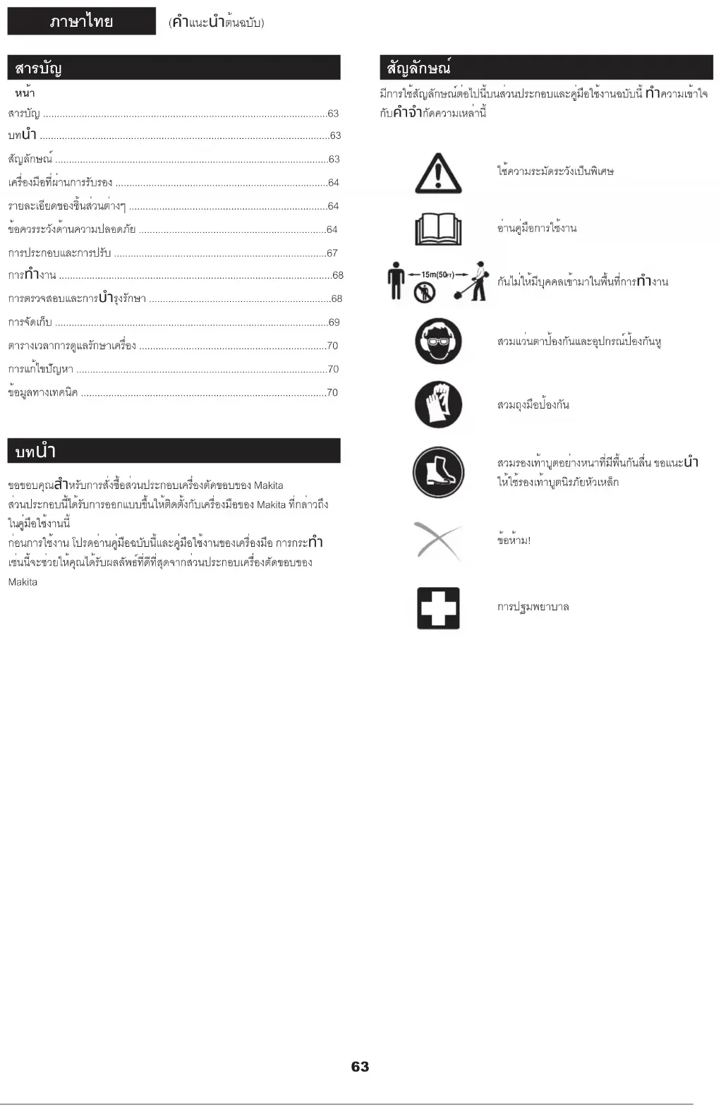 อย่าเปลี่ยนการตั้งค่าควบคุมเครื่องยนต์ หรือเร่งเครื่องยนต์จนความเร็วสูงเกิน• หากผลิตภัณฑ์สั่นผิดปกติ ให้หยุดการทำงานของมอเตอร์ทันที และตรวจสอบ • หาสาเหตุ การสั่นมักจะเป็นสัญญาณเตือนว่ามีสิ่งผิดปกติ หยุดการทำงานของมอเตอร์ทุกครั้งที่คุณจะออกจากบริเวณที่ทำงานอยู่ ถอด • แบตเตอรี่หรือสายหัวเทียนออกก่อนที่จะคลายเครื่องป้องกันของเครื่องมือตัด หรือเมื่อจะทำการซ่อมแซม, ปรับ หรือตรวจสอบ ใช้งานผลิตภัณฑ์จากตำแหน่งที่อุปกรณ์ป้องกันปิดกั้นเส้นทางการมอง • เครื่องมือตัด ในกรณีฉุกเฉิน ให้ปิดสวิตช์มอเตอร์ทันที• ในระหว่างการทำงาน หากคุณรู้สึกว่าเกิดความผิดปกติขึ้น (เช่น เสียงรบกวน, • การสั่นสะเทือน) ให้ปิดสวิตช์มอเตอร์ อย่าใช้งานอุปกรณ์จนกว่าจะรู้สาเหตุและ แก้ไขปัญหาแล้ว หลังจากปล่อยไกคันเร่งน้ำมันหรือปิดสวิตช์เครื่องยนต์ เครื่องตัดจะยังคงหมุนต่อไป• สักระยะหนึ่ง อย่ารีบร้อนสัมผัสเครื่องตัด ประกอบสายสะพายไหล่เมื่อเครื่องยนต์ทำงานในอัตรารอบเดินเบาเท่านั้น• ในระหว่างการทำงาน ให้ใช้สายสะพายไหล่ ถืออุปกรณ์ทางด้านขวาของคุณ • อย่างมั่นคง จับมือจับด้านหน้าด้วยมือซ้าย และมือจับด้านหลังด้วยมือขวา ไม่ว่าคุณจะเป็น • คนที่ถนัดขวาหรือถนัดซ้ายก็ตาม กำรอบมือจับให้แน่นโดยให้นิ้วหัวแม่มือชน กับนิ้วอื่น อย่าพยายามใช้งานอุปกรณ์โดยใช้มือเพียงข้างเดียว การสูญเสียความควบคุม • อาจทำให้เกิดการบาดเจ็บร้ายแรงหรือเสียชีวิตได้ เพื่อลดความเสี่ยงจาก การบาดเจ็บ ระวังให้มือและเท้าของคุณอยู่ห่างจากเครื่องตัด อย่าทำงานในระยะที่สุดเอื้อม จัดท่าการยืนและการทรงตัวให้เหมาะสม • ตลอดเวลา ระมัดระวังสิ่งกีดขวางที่ซ่อนอยู่ เช่น ตอไม้ รากไม้ และคูน้ำ เพื่อป้องกันการสะดุด อย่าทำงานบนบันไดหรือต้นไม้ ทั้งนี้ เพื่อป้องกันการสูญเสียความควบคุม• หากอุปกรณ์ได้รับแรงกระแทกอย่างรุนแรงหรือร่วงหล่น ให้ตรวจสอบสภาพ • ของอุปกรณ์ก่อนทำงานต่อไป ตรวจสอบระบบเชื้อเพลิงเพื่อหาการรั่วไหลของ น้ำมันเชื้อเพลิง และอุปกรณ์ควบคุมและอุปกรณ์นิรภัยอื่นๆ เพื่อหาการทำงาน ที่ผิดปกติ หากมีความเสียหาย หรือมีข้อสงสัย ควรสอบถามศูนย์บริการที่ได้รับ อนุญาตของ Makita เพื่อทำการตรวจสอบและซ่อมแซม อย่าสัมผัสกระปุกเฟืองเกียร์ ระหว่างการทำงาน กระปุกเฟืองเกียร์อาจร้อน• หยุดพักสักครู่ เพื่อป้องกันการสูญเสียความควบคุมอันเนื่องมาจากความ • เหนื่อยล้า ขอแนะนำให้คุณหยุดพัก 10 - 20 นาที ทุกๆ ชั่วโมง เมื่อคุณปล่อยอุปกรณ์ทิ้งไว้ แม้ในระยะสั้นๆ ควรปิดสวิตช์