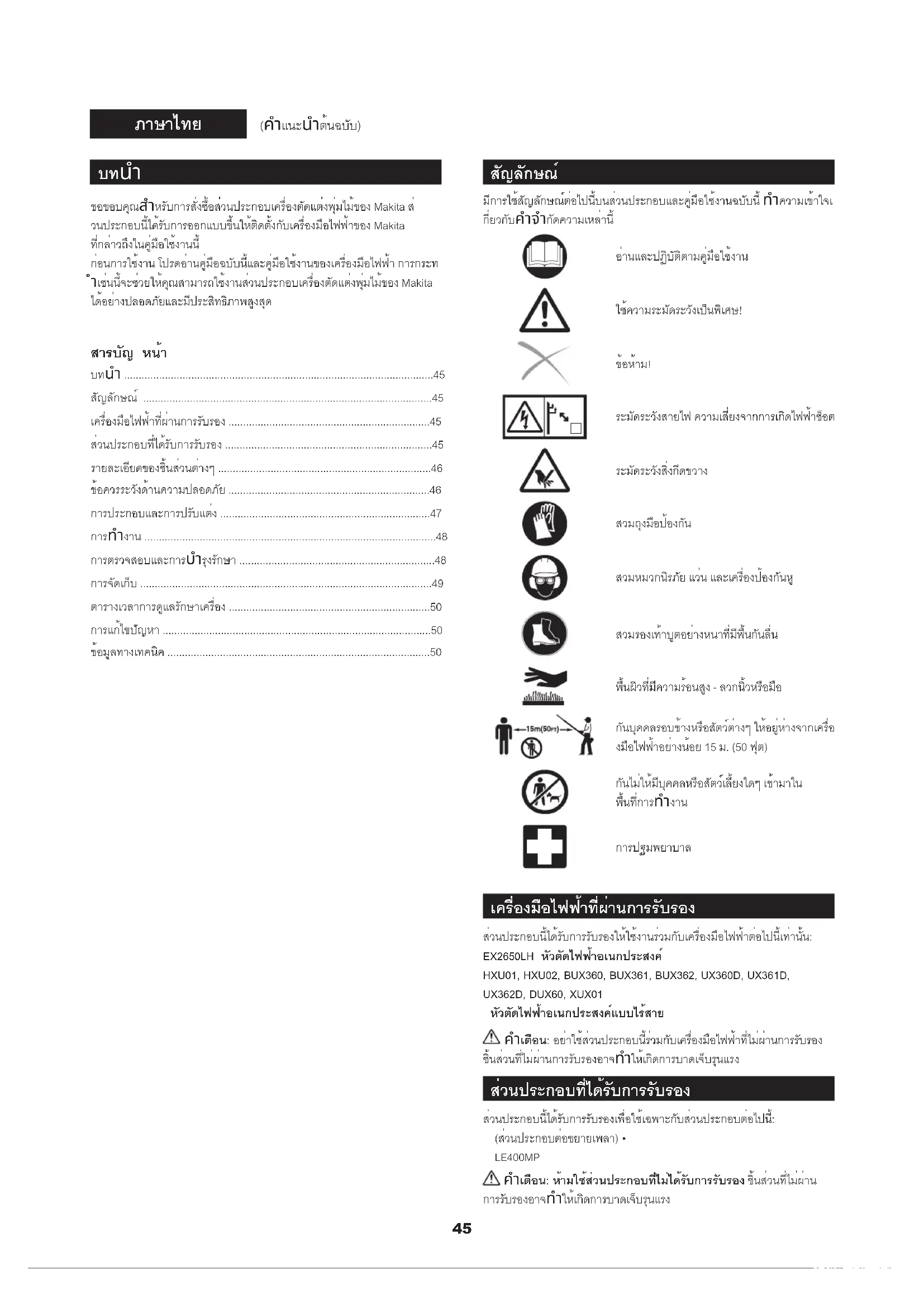 - ขอขอบคุณสำหรับการสั่งซื้อส่วนประกอบเครื่องตัดแต่งพุ่มไม้ของ Makita ส่ วนประกอบนี้ได้รับการออกแบบขึ้นให้ติดตั้งกับเครื่องมือไฟฟ้าของ Makita ที่กล่าวถึงในคู่มือใช้งานนี้ ก่อนการใช้งาน โปรดอ่านคู่มือฉบับนี้และคู่มือใช้งานของเครื่องมือไฟฟ้า การกระท ำเช่นนี้จะช่วยให้คุณสามารถใช้งานส่วนประกอบเครื่องตัดแต่งพุ่มไม้ของ Makita ได้อย่างปลอดภัยและมีประสิทธิภาพสูงสุด สารบัญ หน้า บทนำ p. 45